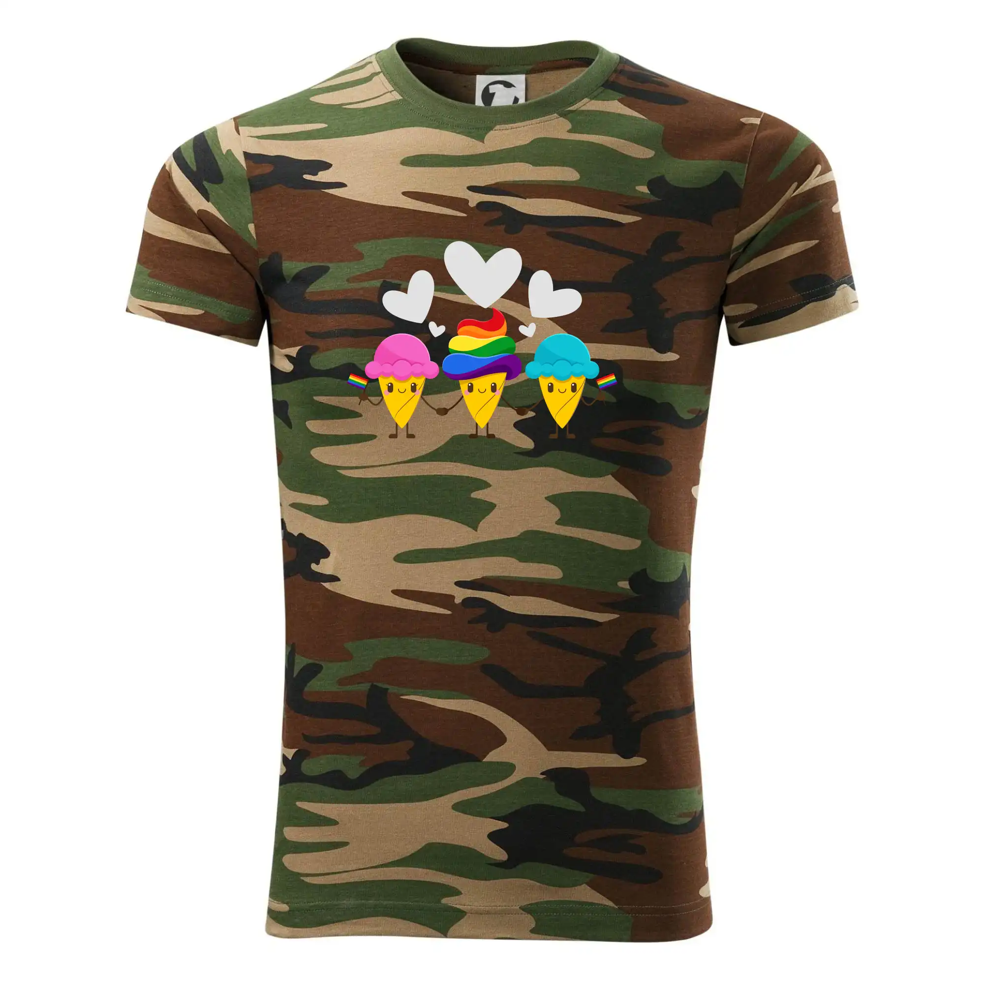 Tričko strednej gramáže vo farbách camouflage. Strih s bočnými švami. Lem priekrčníku z rebrového úpletu s prídavkom 5% elastanu. Vnútorná časť zadného priekrčníka začistená páskou vo farbe camouflage.