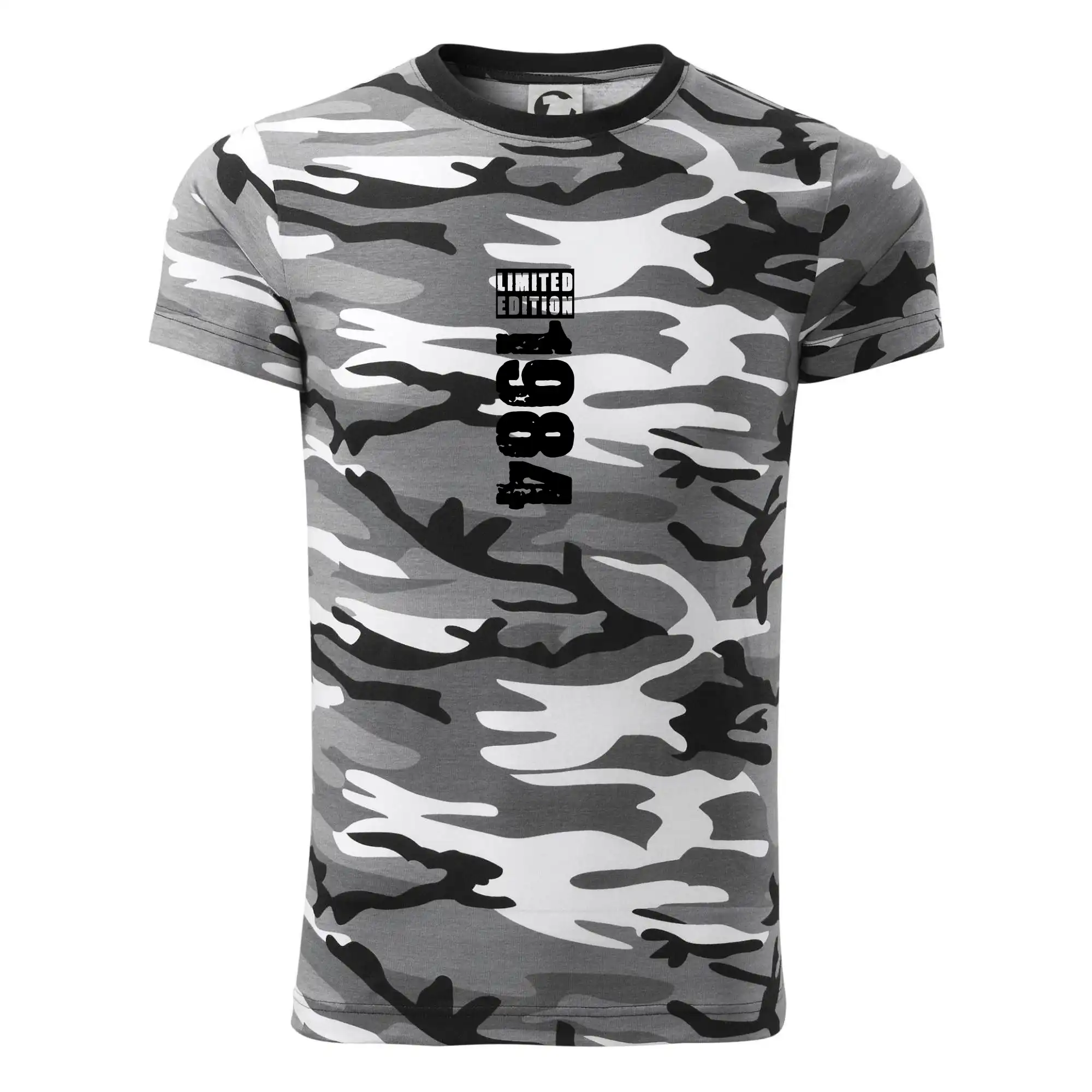Tričko strednej gramáže vo farbách camouflage. Strih s bočnými švami. Lem priekrčníku z rebrového úpletu s prídavkom 5% elastanu. Vnútorná časť zadného priekrčníka začistená páskou vo farbe camouflage.
