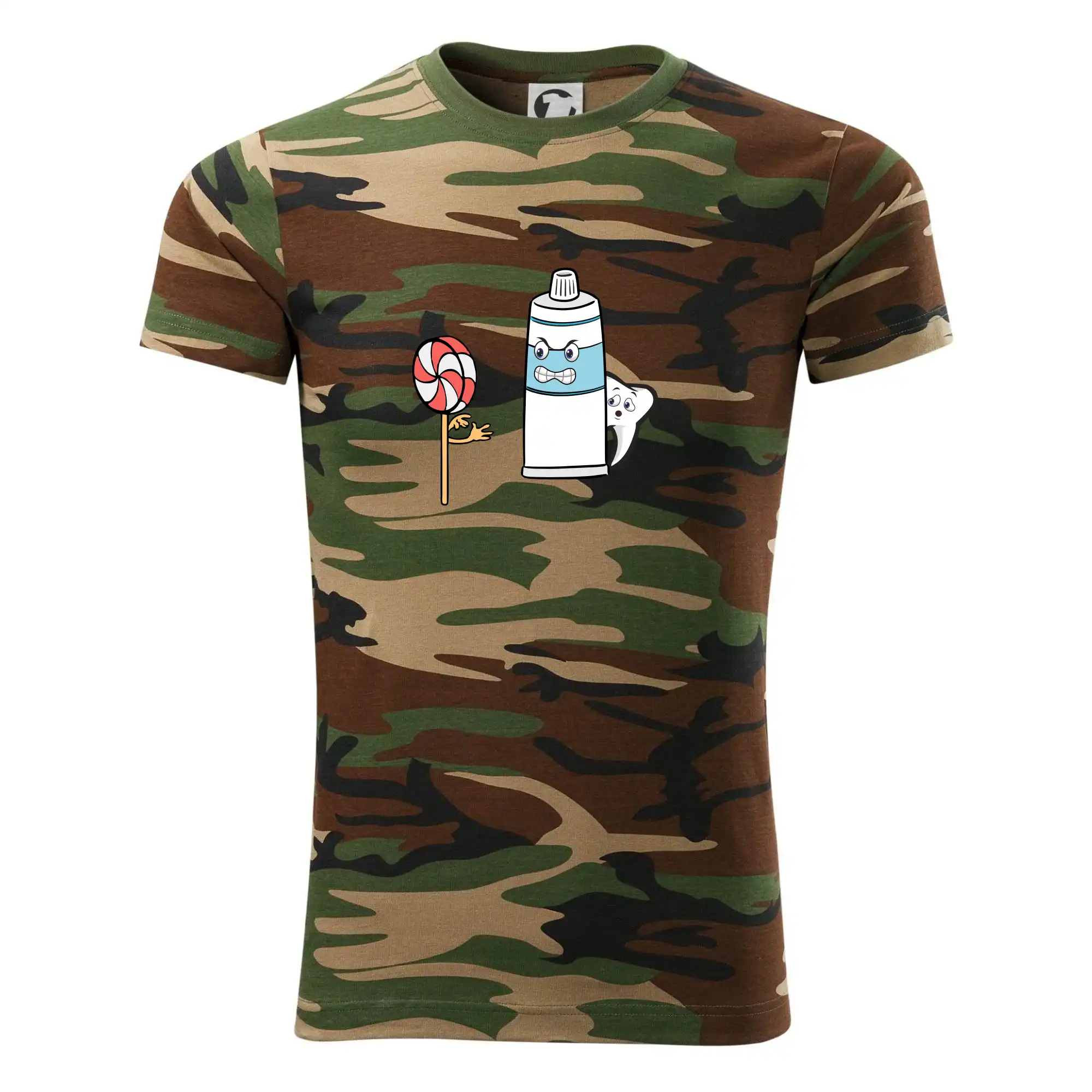 Tričko strednej gramáže vo farbách camouflage. Strih s bočnými švami. Lem priekrčníku z rebrového úpletu s prídavkom 5% elastanu. Vnútorná časť zadného priekrčníka začistená páskou vo farbe camouflage.