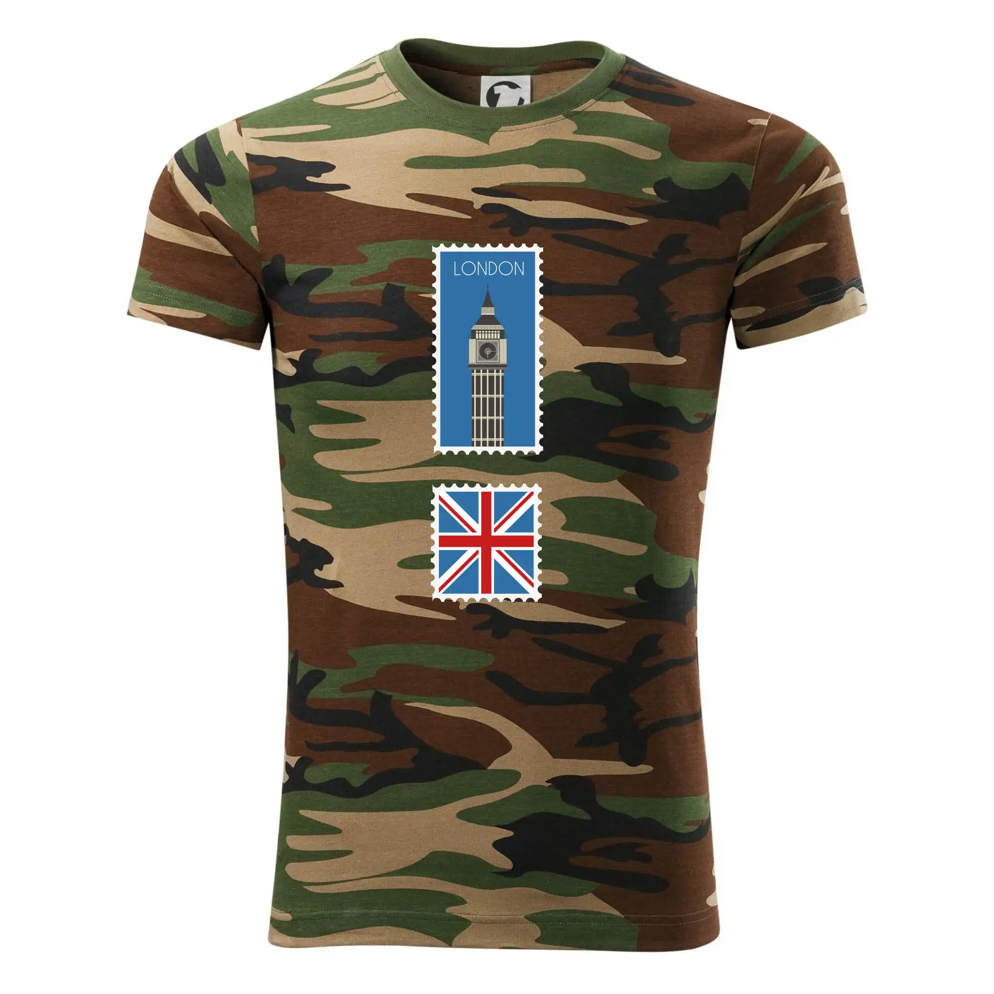 Tričko strednej gramáže vo farbách camouflage. Strih s bočnými švami. Lem priekrčníku z rebrového úpletu s prídavkom 5% elastanu. Vnútorná časť zadného priekrčníka začistená páskou vo farbe camouflage.