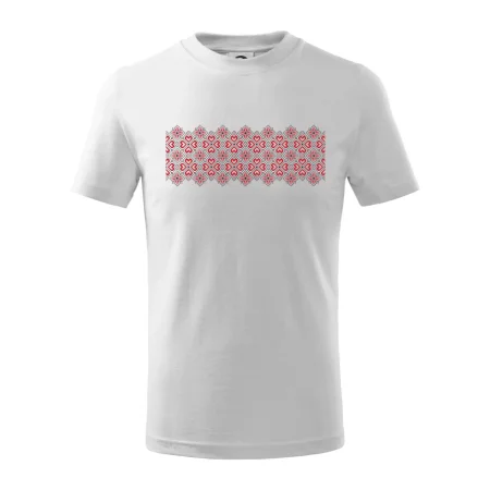 Detské tričko strednej gramáže s bočnými švami. Úzky priekrčník s prídavkom 5% elastanu. Vnútorná časť zadného priekrčníka začistená tkanou páskou. Spevnený ramenný šev.