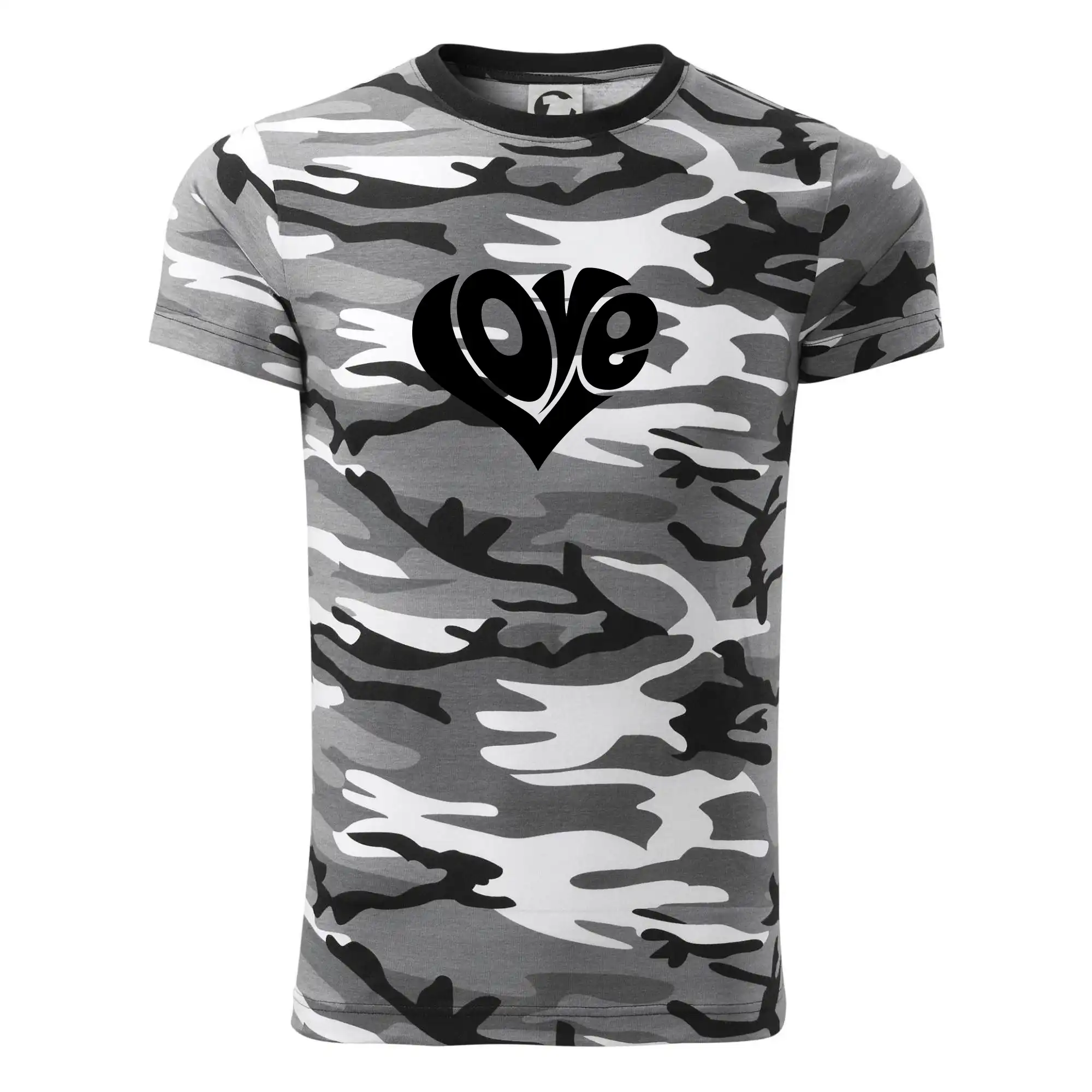 Tričko strednej gramáže vo farbách camouflage. Strih s bočnými švami. Lem priekrčníku z rebrového úpletu s prídavkom 5% elastanu. Vnútorná časť zadného priekrčníka začistená páskou vo farbe camouflage.