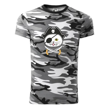 Tričko strednej gramáže vo farbách camouflage. Strih s bočnými švami. Lem priekrčníku z rebrového úpletu s prídavkom 5% elastanu. Vnútorná časť zadného priekrčníka začistená páskou vo farbe camouflage.