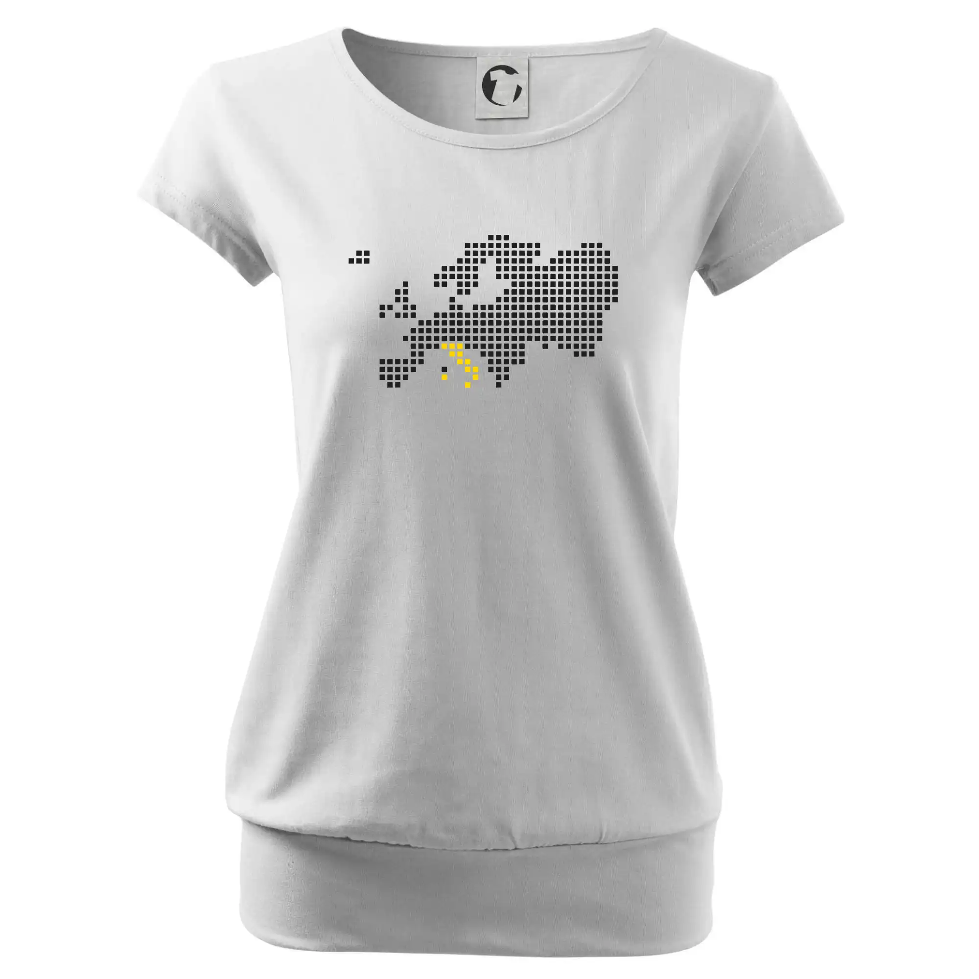 Trendové dámske tričko s veľmi krátkym rukávom, voľnejšieho strihu, v dolnom kraji všité do širokého lemu. Okrúhly priekrčník s úzkym lemom zo zhodného materiálu.