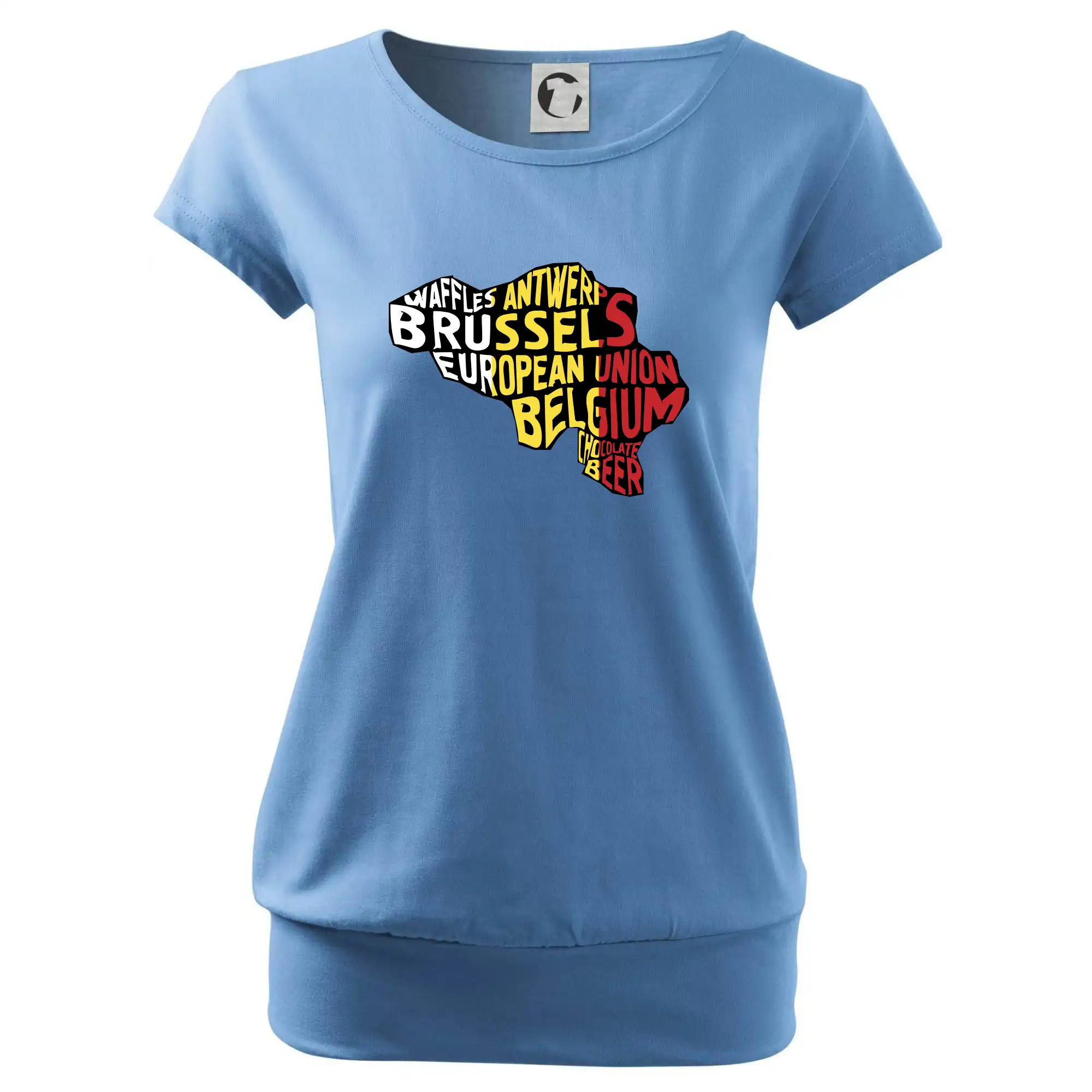 Trendové dámske tričko s veľmi krátkym rukávom, voľnejšieho strihu, v dolnom kraji všité do širokého lemu. Okrúhly priekrčník s úzkym lemom zo zhodného materiálu.