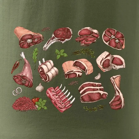 Tričko, ktoré je plné mäsa, by si mal zaobstarať každý kuchár. Na tričku nájdeš rebierka, stehno ale aj mleté mäso. Tričko pre kuchára, musí mať každý správny šéfkuchár aj kuchtík.