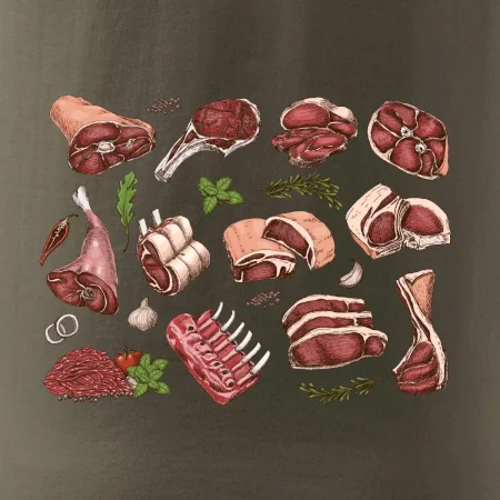 Tričko, ktoré je plné mäsa, by si mal zaobstarať každý kuchár. Na tričku nájdeš rebierka, stehno ale aj mleté mäso. Tričko pre kuchára, musí mať každý správny šéfkuchár aj kuchtík.