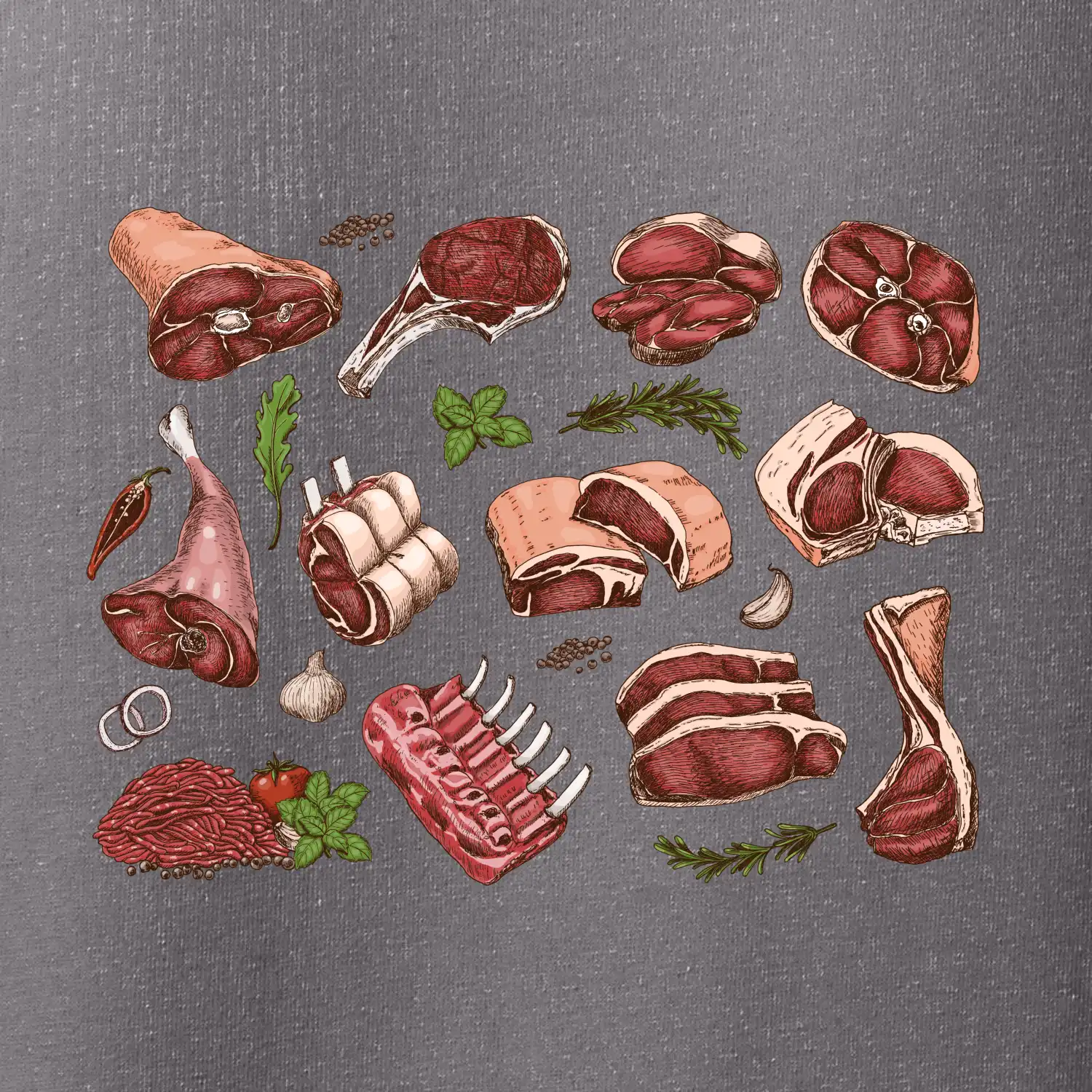 Tričko, ktoré je plné mäsa, by si mal zaobstarať každý kuchár. Na tričku nájdeš rebierka, stehno ale aj mleté mäso. Tričko pre kuchára, musí mať každý správny šéfkuchár aj kuchtík.