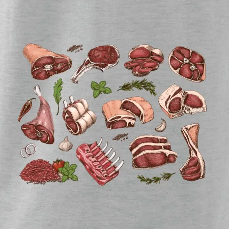 Tričko, ktoré je plné mäsa, by si mal zaobstarať každý kuchár. Na tričku nájdeš rebierka, stehno ale aj mleté mäso. Tričko pre kuchára, musí mať každý správny šéfkuchár aj kuchtík.