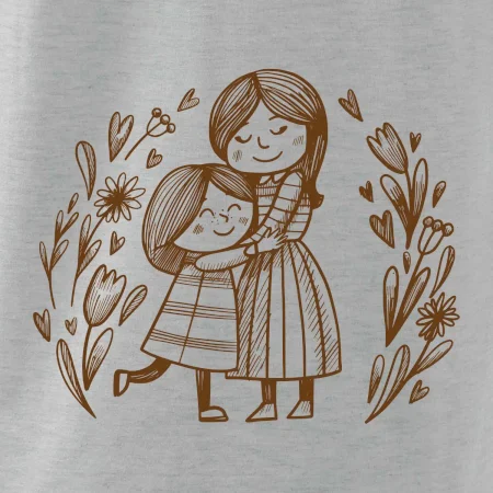 Tričko pre mamičku, na ktorom je mamička a dcéra v objatí. Na motíve dievča objíma matku, v okolí sú rozkvitnuté kvetiny. Materská láska sa dá vyjadriť aj tričkom. Motív, ktorý urobí Vašej mamičke veľkú radosť. Ukážte, že je pre Vás rodiny dôležitá.