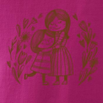 Tričko pre mamičku, na ktorom je mamička a dcéra v objatí. Na motíve dievča objíma matku, v okolí sú rozkvitnuté kvetiny. Materská láska sa dá vyjadriť aj tričkom. Motív, ktorý urobí Vašej mamičke veľkú radosť. Ukážte, že je pre Vás rodiny dôležitá.