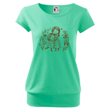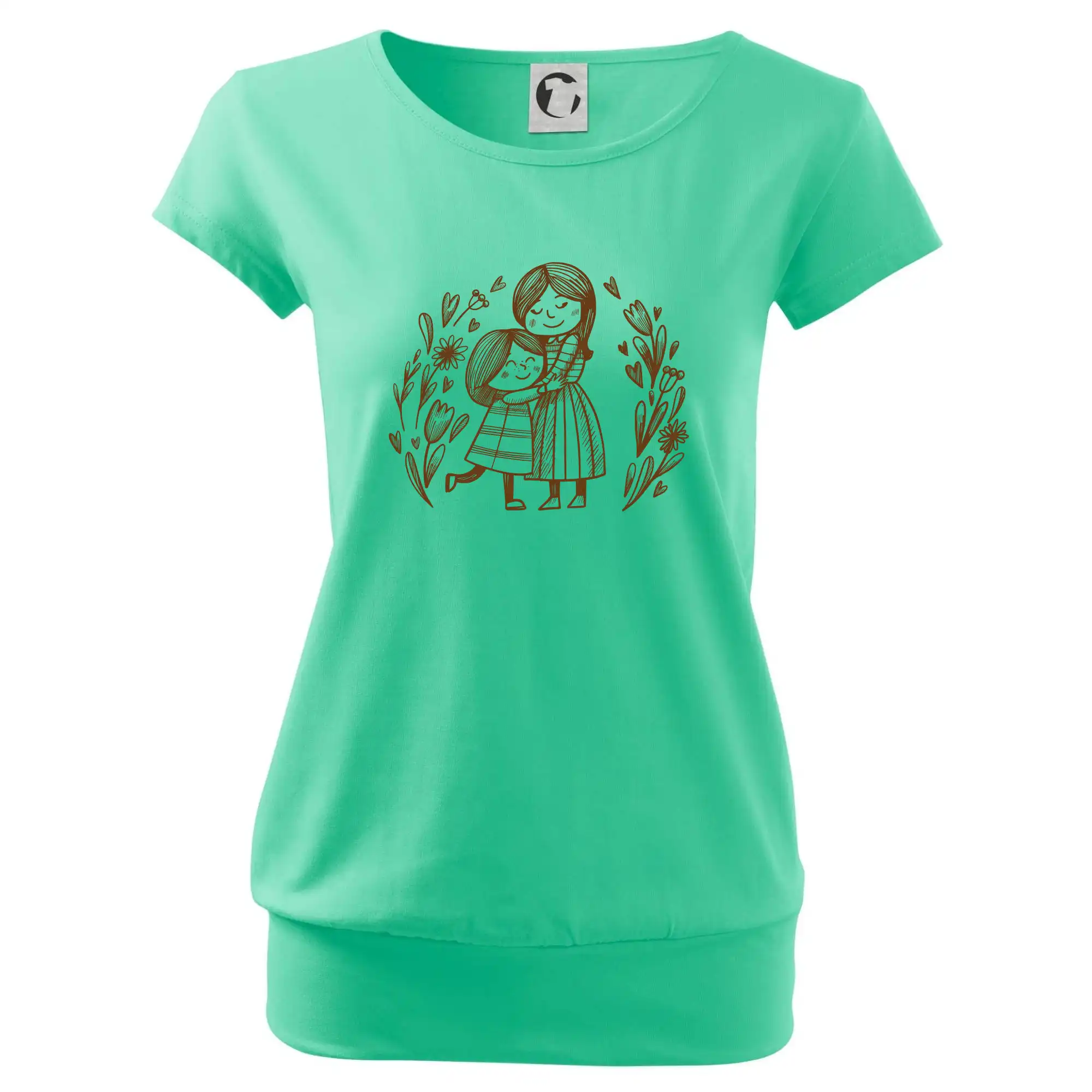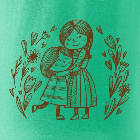 Tričko pre mamičku, na ktorom je mamička a dcéra v objatí. Na motíve dievča objíma matku, v okolí sú rozkvitnuté kvetiny. Materská láska sa dá vyjadriť aj tričkom. Motív, ktorý urobí Vašej mamičke veľkú radosť. Ukážte, že je pre Vás rodiny dôležitá.