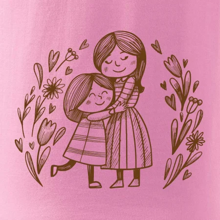 Tričko pre mamičku, na ktorom je mamička a dcéra v objatí. Na motíve dievča objíma matku, v okolí sú rozkvitnuté kvetiny. Materská láska sa dá vyjadriť aj tričkom. Motív, ktorý urobí Vašej mamičke veľkú radosť. Ukážte, že je pre Vás rodiny dôležitá.