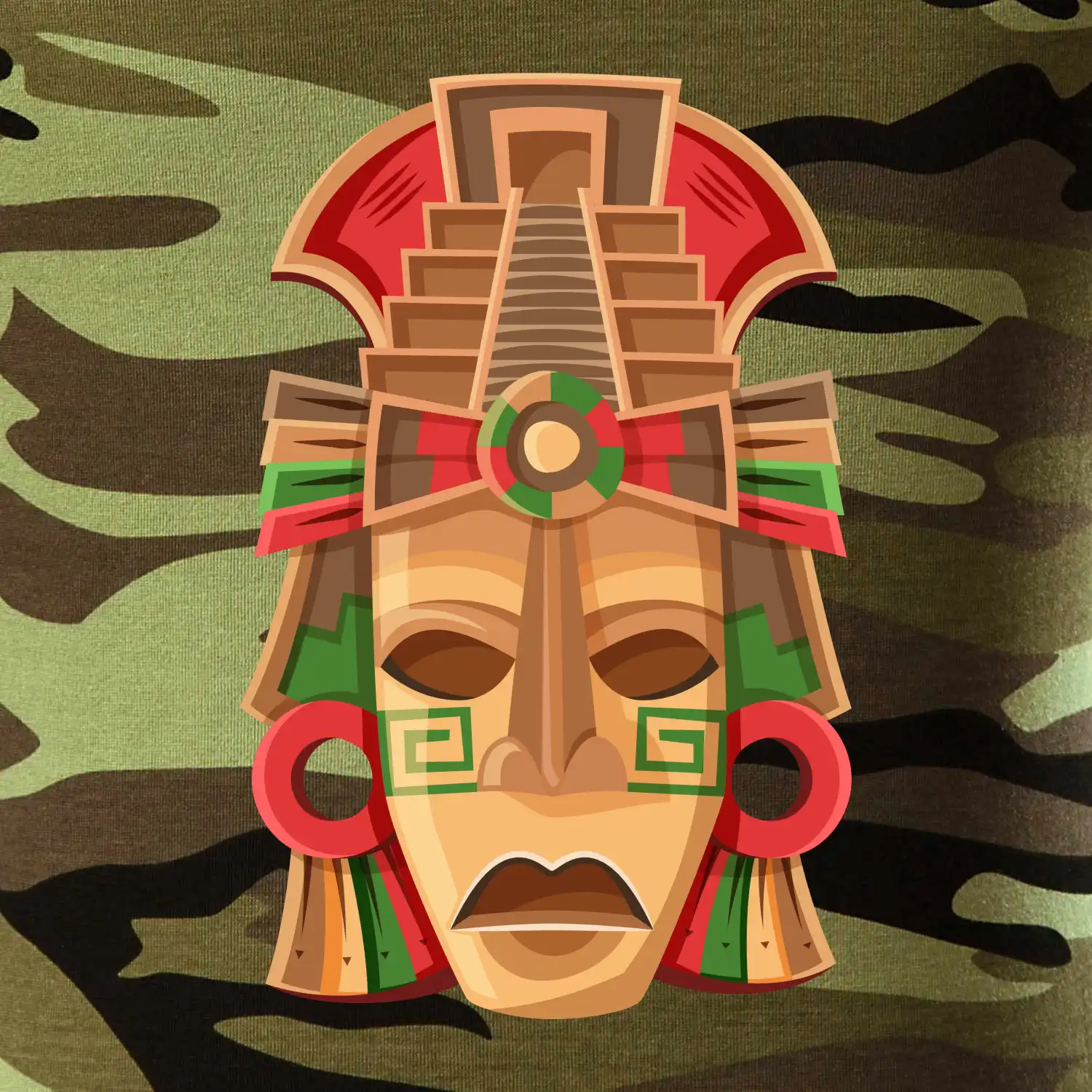 Tričko strednej gramáže vo farbách camouflage. Strih s bočnými švami. Lem priekrčníku z rebrového úpletu s prídavkom 5% elastanu. Vnútorná časť zadného priekrčníka začistená páskou vo farbe camouflage.
