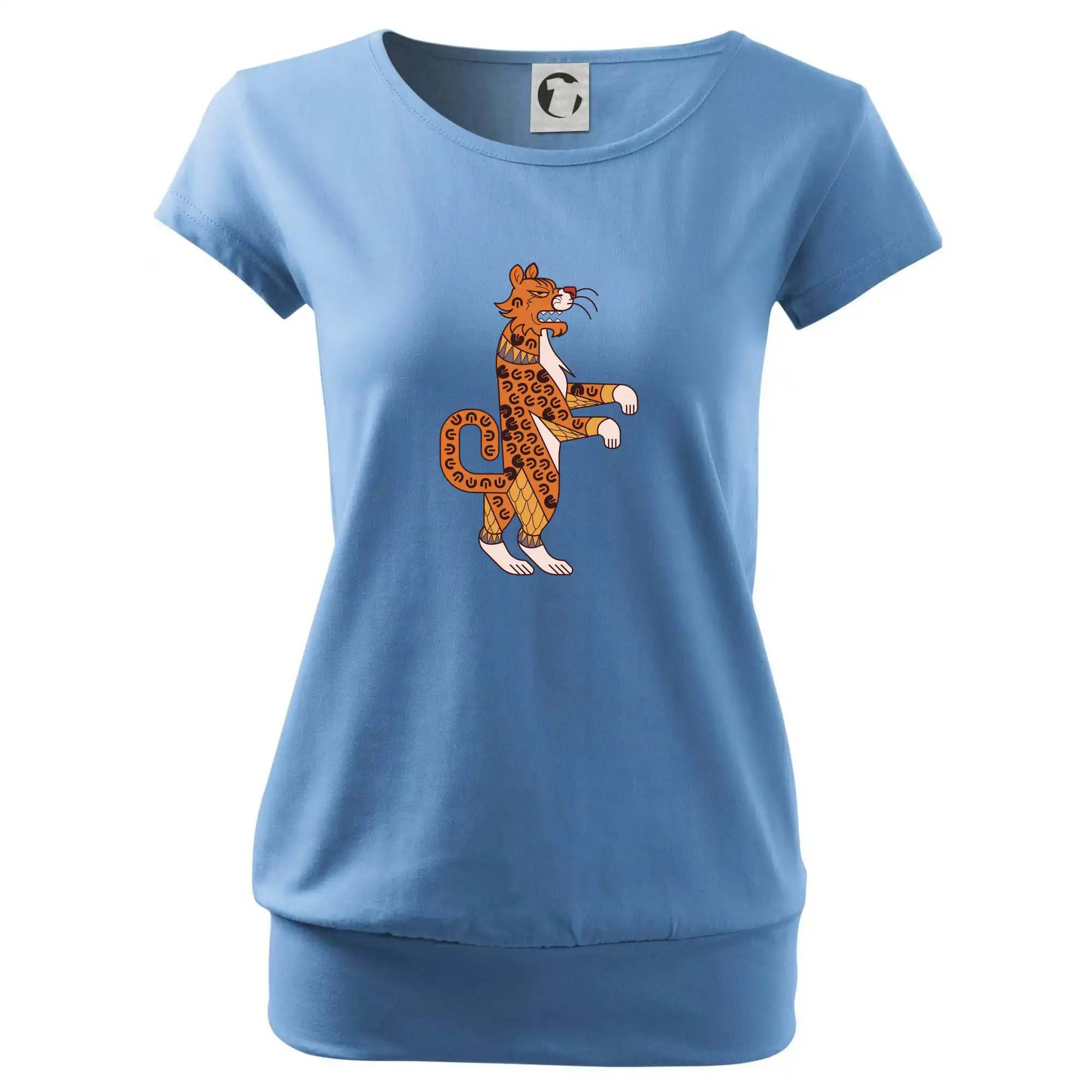 Trendové dámske tričko s veľmi krátkym rukávom, voľnejšieho strihu, v dolnom kraji všité do širokého lemu. Okrúhly priekrčník s úzkym lemom zo zhodného materiálu.