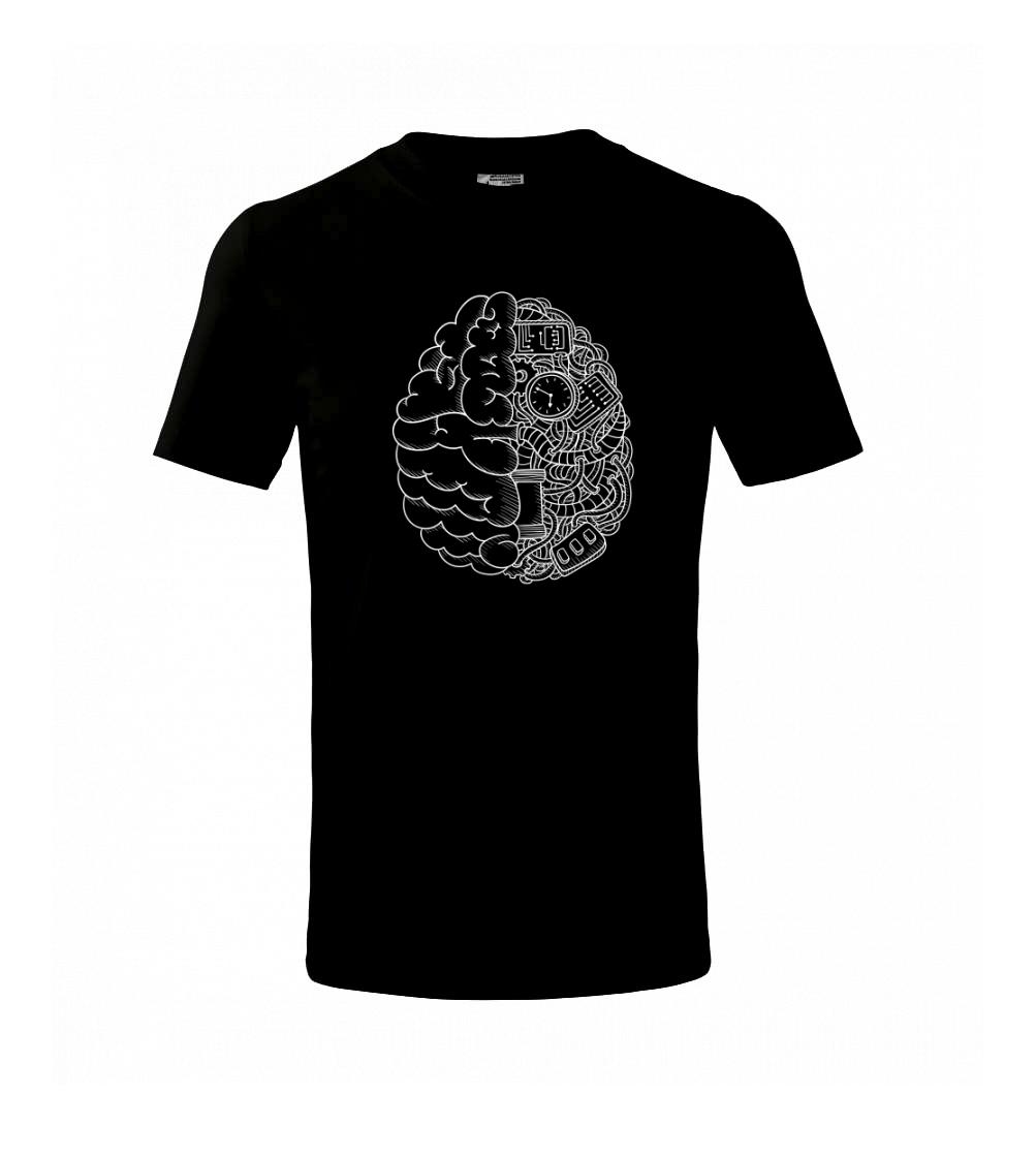 Motív, ktorý poteší každého mysliteľa a vedátora. Tričko pre vedca, na ktorom je mozog. Polovica je prevedená technicky, je tu elektrický obvod, káble a dráty...Tričko s mozgom poteší každého, kto je pravý vedec.