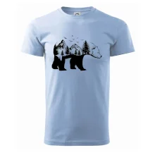 Tričko s medveďom je vhodné pre všetkých milovníkov zvierat a prírody. Hlavný motív je zviera - medveď. Hory a stromy na tričku nechýbajú tiež, je to predsa medveďov domov. tričko, na ktorom je medveď je vhodný darček pokiaľ si milovník zvierat.