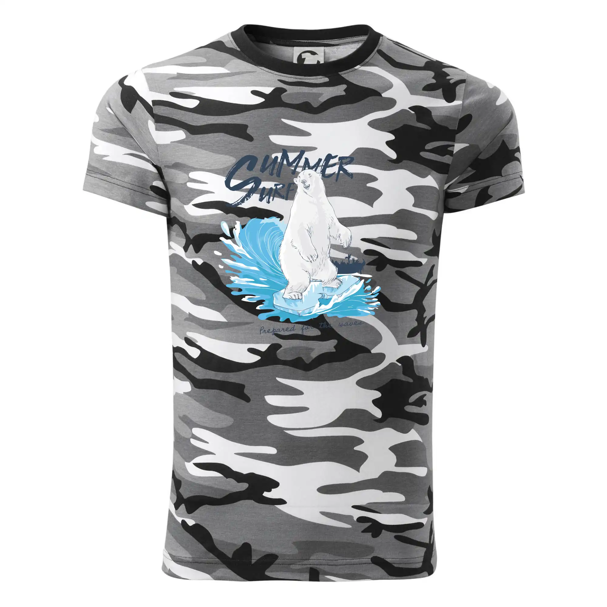 Tričko strednej gramáže vo farbách camouflage. Strih s bočnými švami. Lem priekrčníku z rebrového úpletu s prídavkom 5% elastanu. Vnútorná časť zadného priekrčníka začistená páskou vo farbe camouflage.