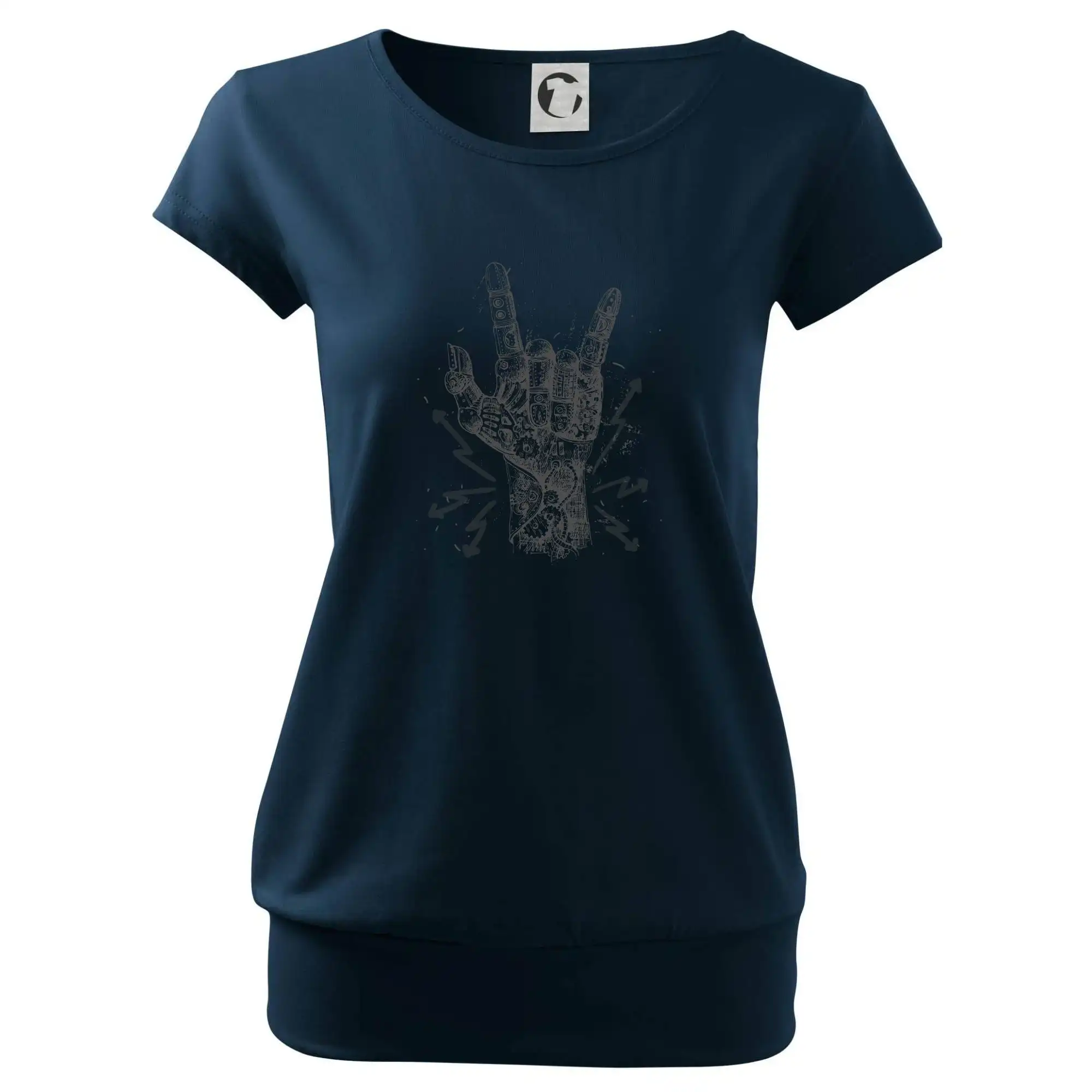 Trendové dámske tričko s veľmi krátkym rukávom, voľnejšieho strihu, v dolnom kraji všité do širokého lemu. Okrúhly priekrčník s úzkym lemom zo zhodného materiálu.