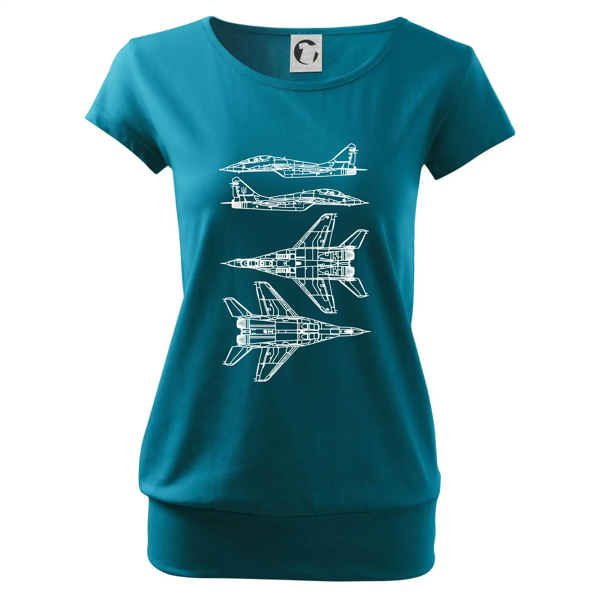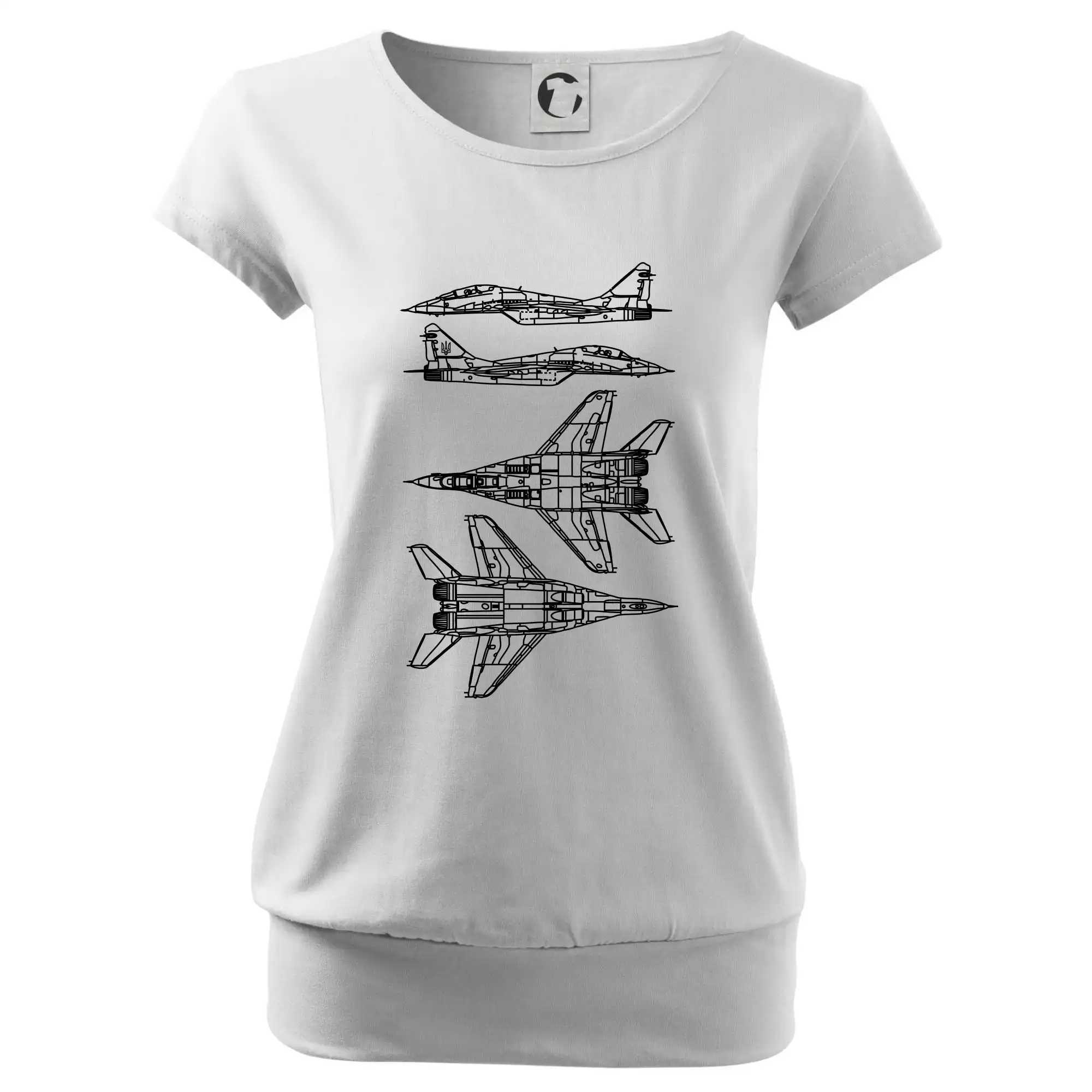 Trendové dámske tričko s veľmi krátkym rukávom, voľnejšieho strihu, v dolnom kraji všité do širokého lemu. Okrúhly priekrčník s úzkym lemom zo zhodného materiálu.