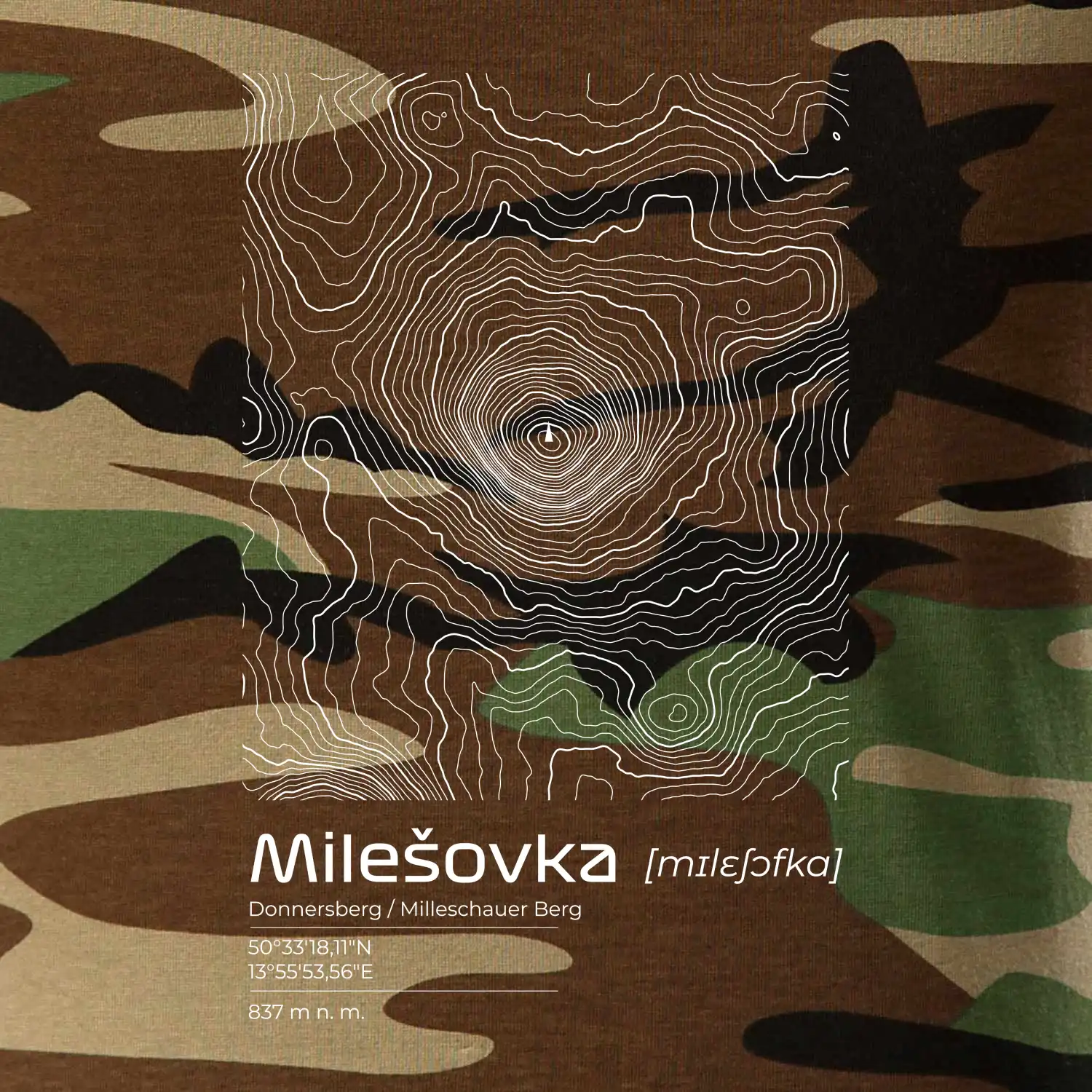 Tričko strednej gramáže vo farbách camouflage. Strih s bočnými švami. Lem priekrčníku z rebrového úpletu s prídavkom 5% elastanu. Vnútorná časť zadného priekrčníka začistená páskou vo farbe camouflage.