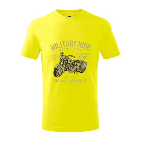 Detské tričko strednej gramáže s bočnými švami. Úzky priekrčník s prídavkom 5% elastanu. Vnútorná časť zadného priekrčníka začistená tkanou páskou. Spevnený ramenný šev.