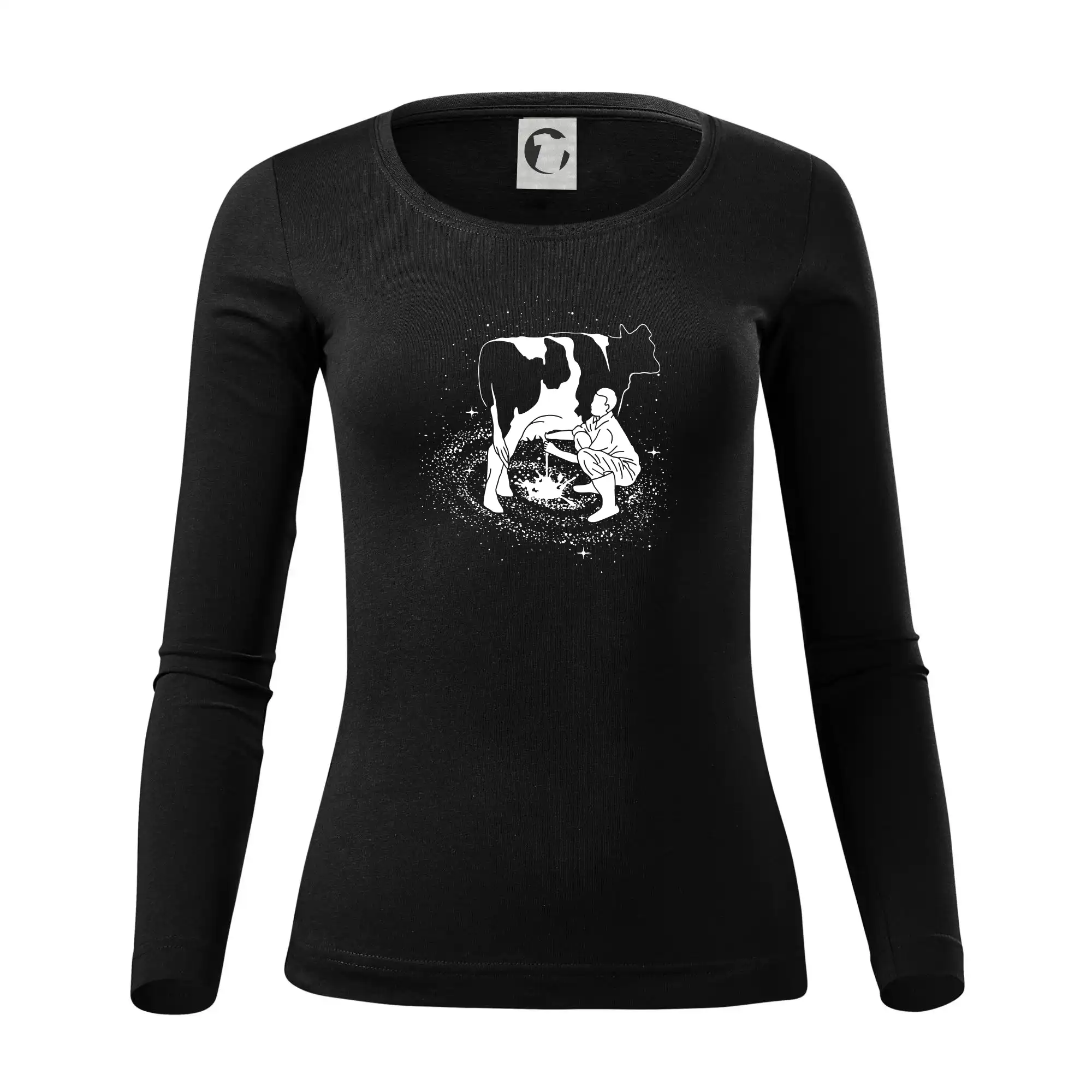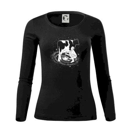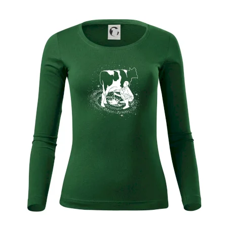 Mléko nevzniká v obchodě v regále. Nejdřív se musí od šikovných zemědělců a farmářů na regál dostat. Pokud máš vztah k zemědělským zvířatům a víš třeba, jak podojit krávu, tak neváhej a kupuj triko s krávou.