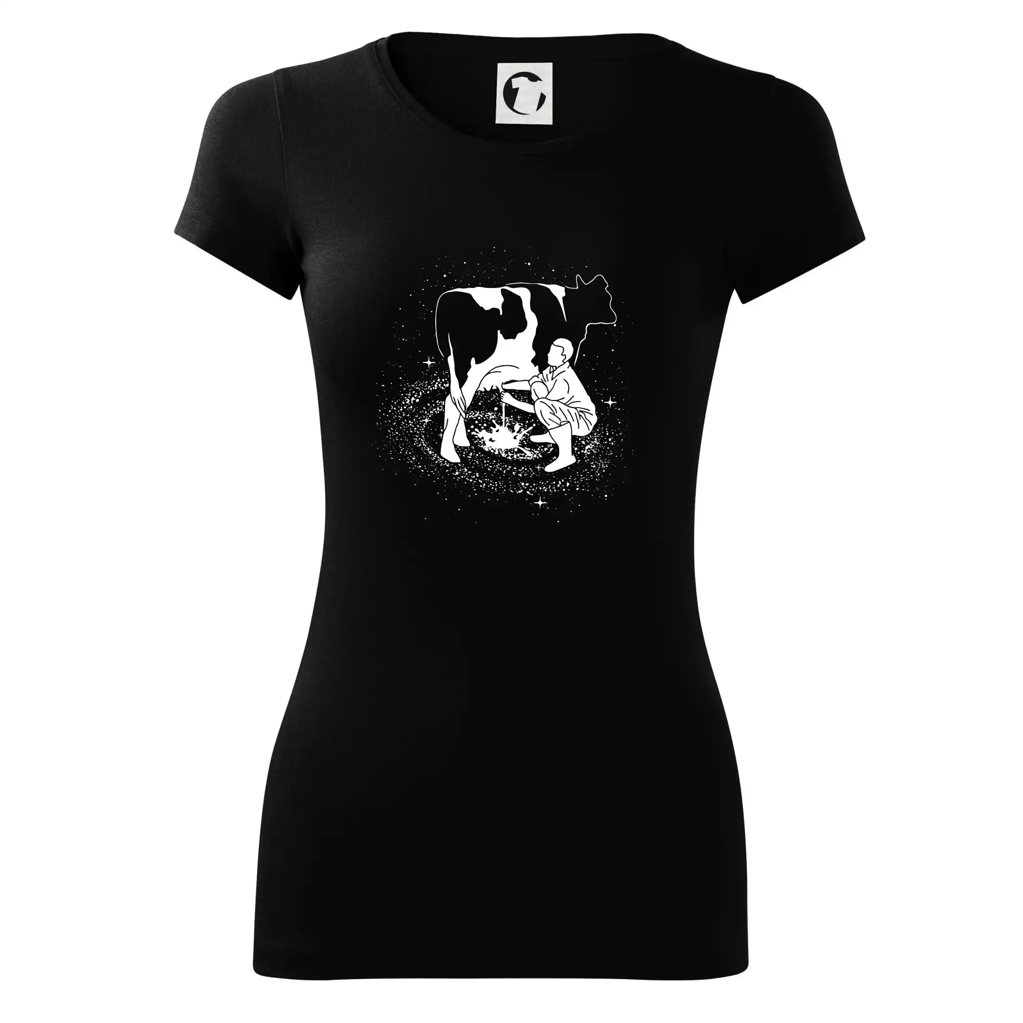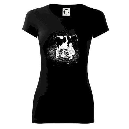 Mléko nevzniká v obchodě v regále. Nejdřív se musí od šikovných zemědělců a farmářů na regál dostat. Pokud máš vztah k zemědělským zvířatům a víš třeba, jak podojit krávu, tak neváhej a kupuj triko s krávou.
