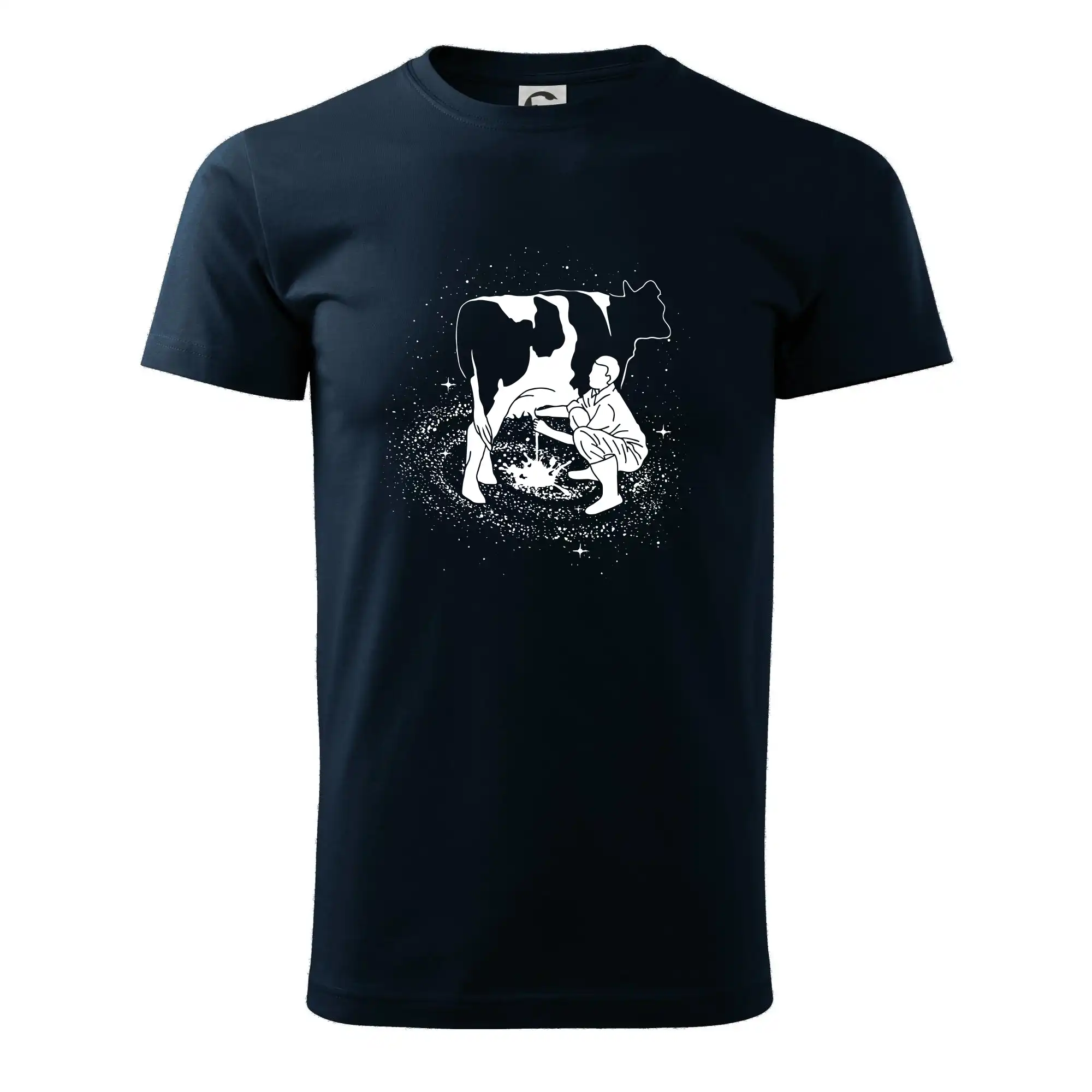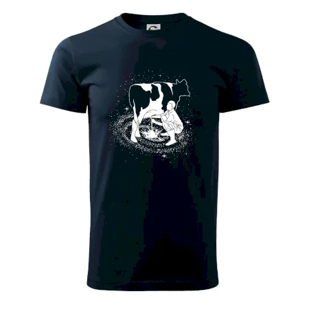 Mléko nevzniká v obchodě v regále. Nejdřív se musí od šikovných zemědělců a farmářů na regál dostat. Pokud máš vztah k zemědělským zvířatům a víš třeba, jak podojit krávu, tak neváhej a kupuj triko s krávou.
