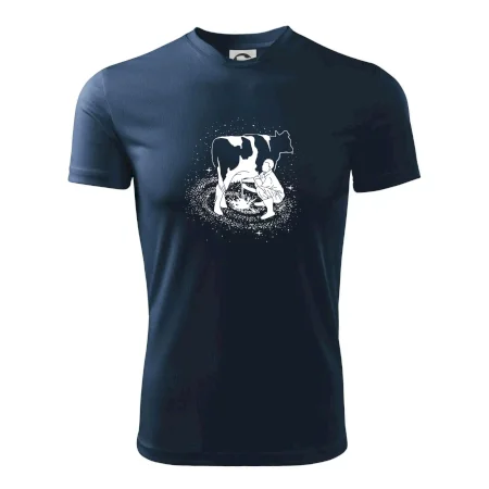 Mléko nevzniká v obchodě v regále. Nejdřív se musí od šikovných zemědělců a farmářů na regál dostat. Pokud máš vztah k zemědělským zvířatům a víš třeba, jak podojit krávu, tak neváhej a kupuj triko s krávou.