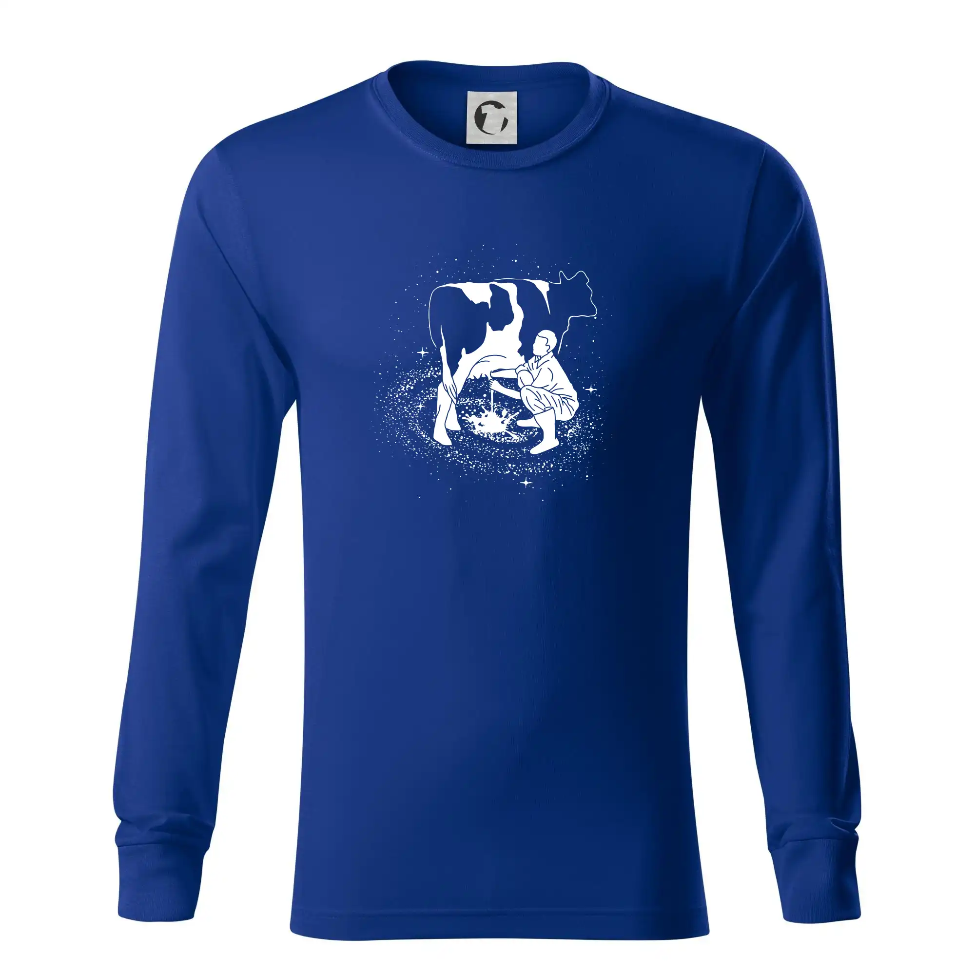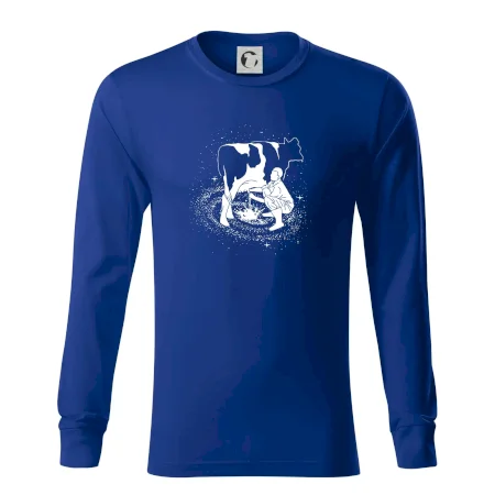 Mléko nevzniká v obchodě v regále. Nejdřív se musí od šikovných zemědělců a farmářů na regál dostat. Pokud máš vztah k zemědělským zvířatům a víš třeba, jak podojit krávu, tak neváhej a kupuj triko s krávou.