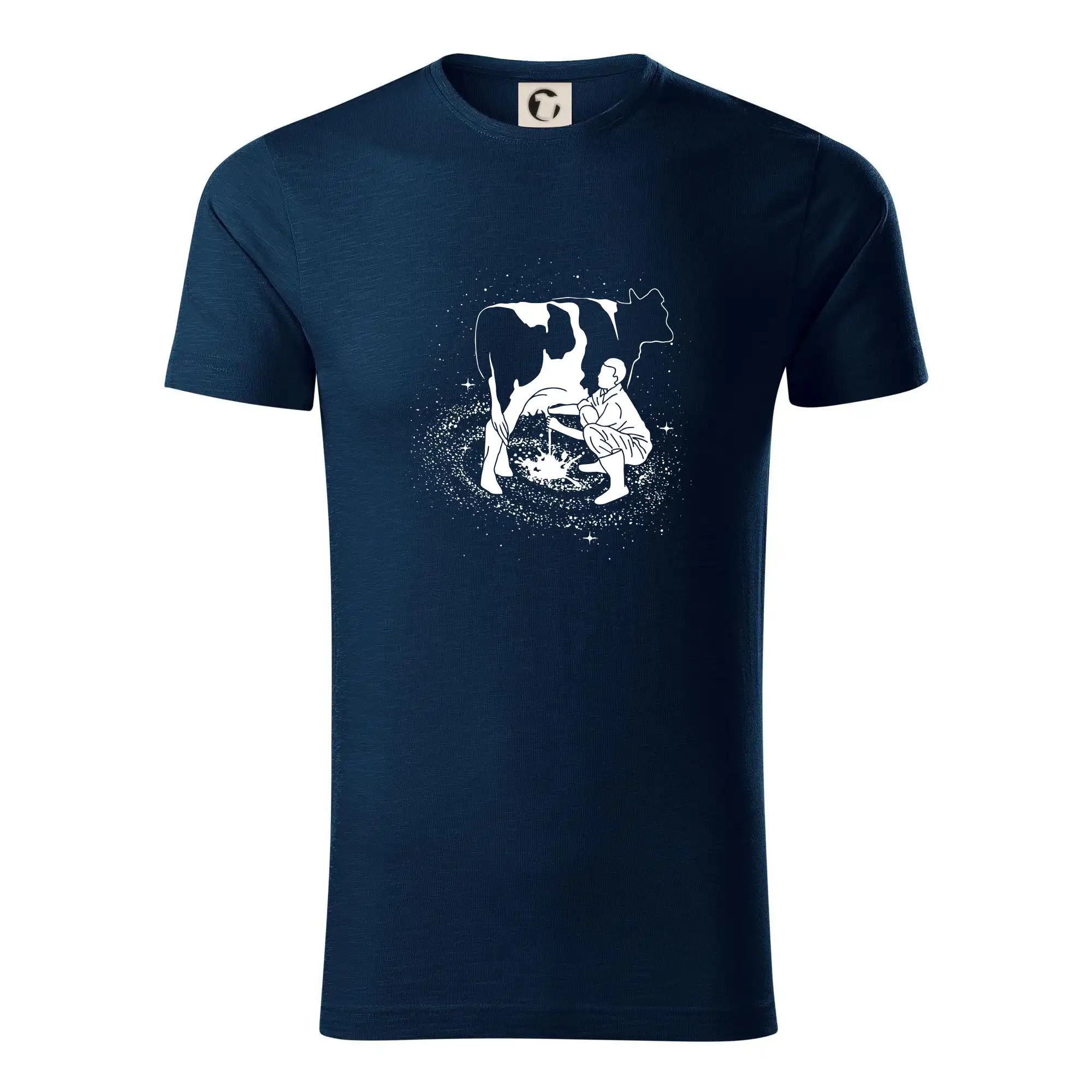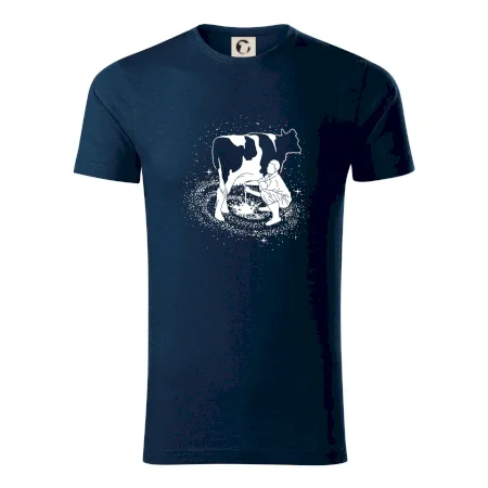 Mléko nevzniká v obchodě v regále. Nejdřív se musí od šikovných zemědělců a farmářů na regál dostat. Pokud máš vztah k zemědělským zvířatům a víš třeba, jak podojit krávu, tak neváhej a kupuj triko s krávou.