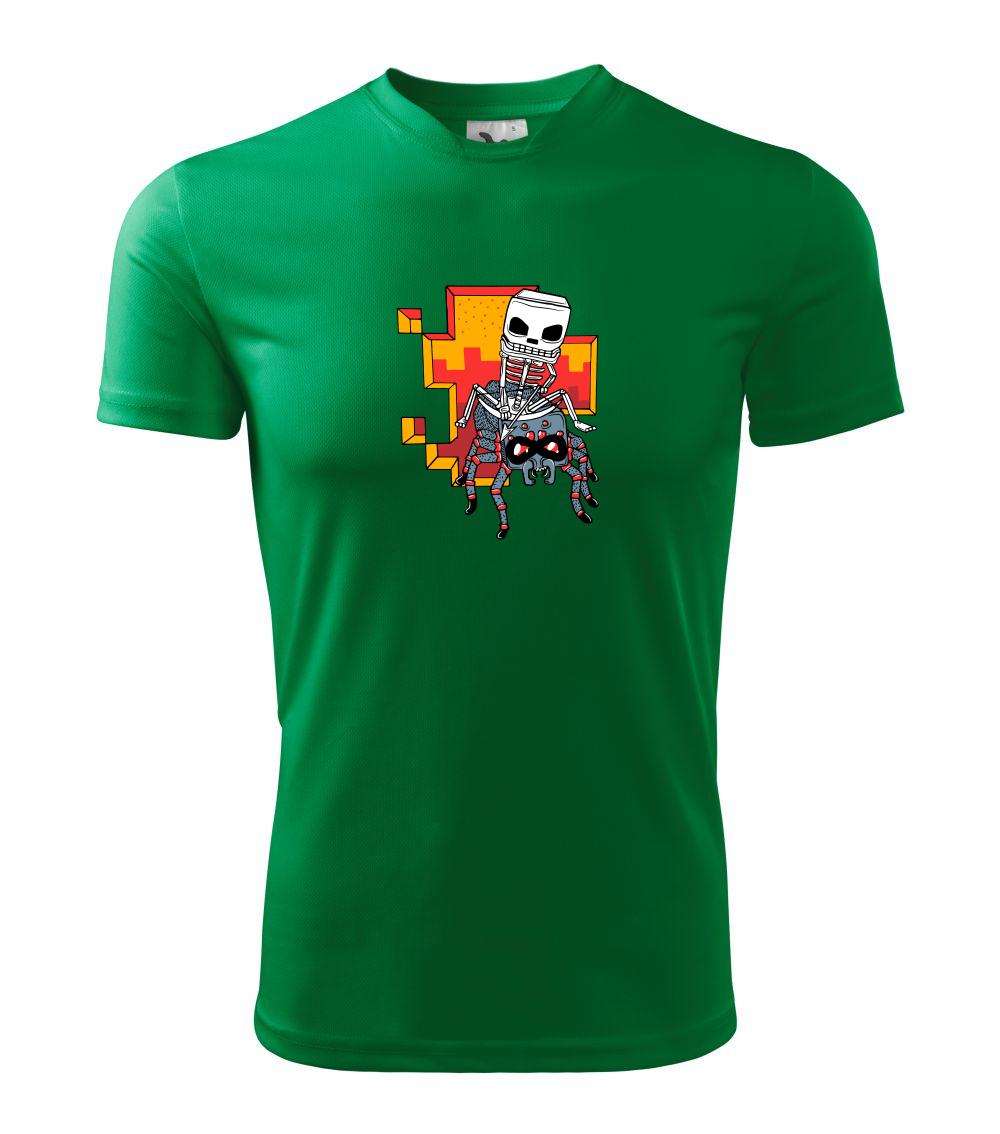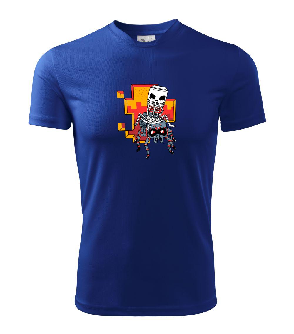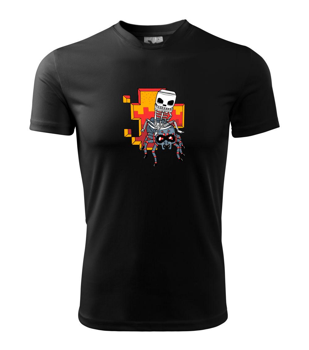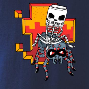 Tričko, na ktorom je kostlivec na pavúkovi. Pavúk sa nechcel nechať skrotiť, ale kostlivec ho nakoniec zdolal. Tričko s kostlivcom idúcim na pavúkovi.