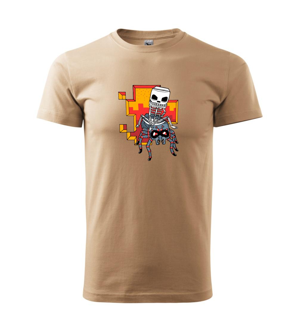 Tričko, na ktorom je kostlivec na pavúkovi. Pavúk sa nechcel nechať skrotiť, ale kostlivec ho nakoniec zdolal. Tričko s kostlivcom idúcim na pavúkovi.