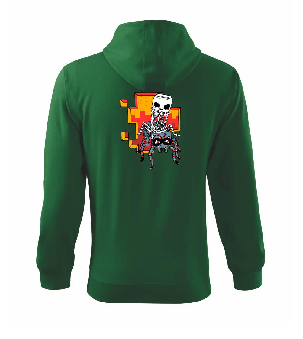Tričko, na ktorom je kostlivec na pavúkovi. Pavúk sa nechcel nechať skrotiť, ale kostlivec ho nakoniec zdolal. Tričko s kostlivcom idúcim na pavúkovi.
