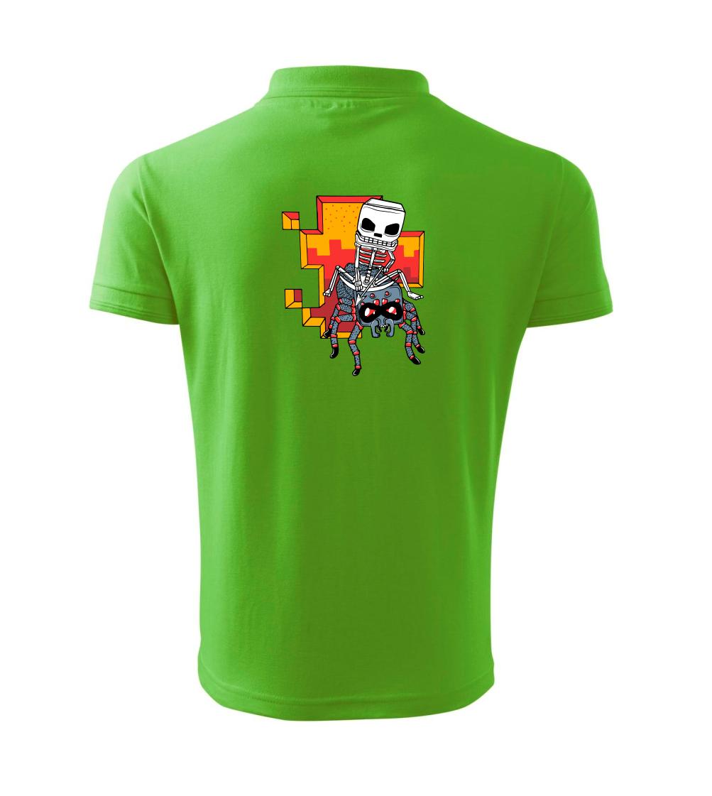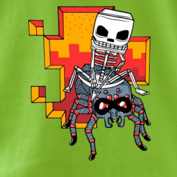 Tričko, na ktorom je kostlivec na pavúkovi. Pavúk sa nechcel nechať skrotiť, ale kostlivec ho nakoniec zdolal. Tričko s kostlivcom idúcim na pavúkovi.