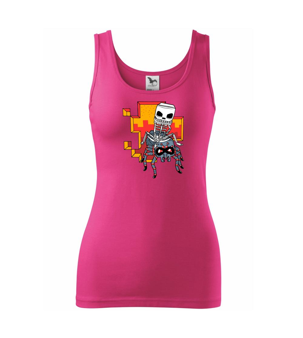 Tričko, na ktorom je kostlivec na pavúkovi. Pavúk sa nechcel nechať skrotiť, ale kostlivec ho nakoniec zdolal. Tričko s kostlivcom idúcim na pavúkovi.