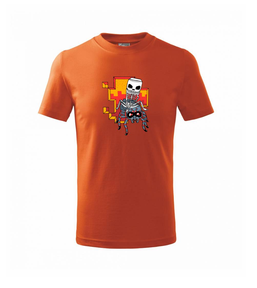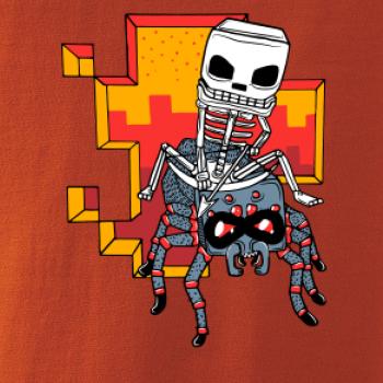 Tričko, na ktorom je kostlivec na pavúkovi. Pavúk sa nechcel nechať skrotiť, ale kostlivec ho nakoniec zdolal. Tričko s kostlivcom idúcim na pavúkovi.