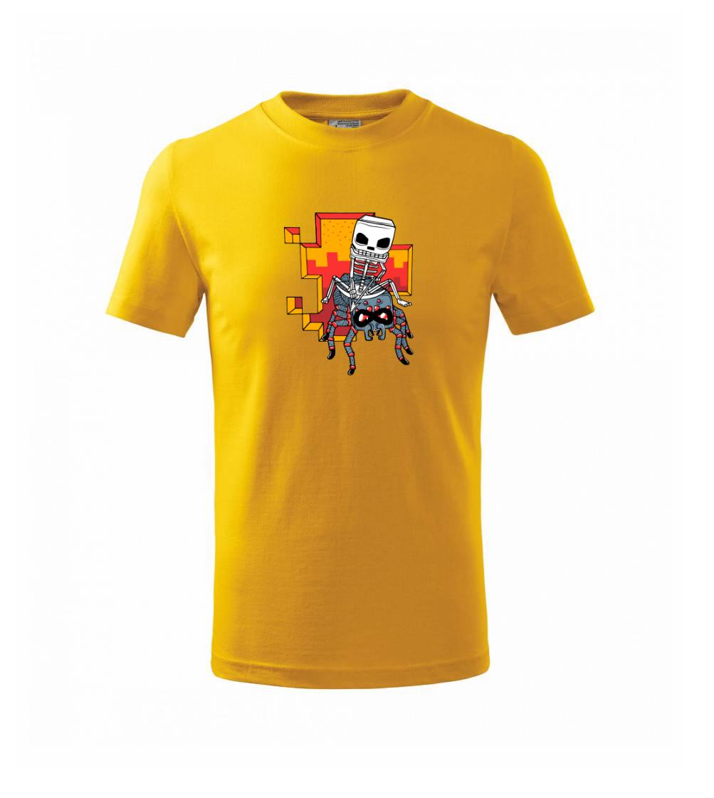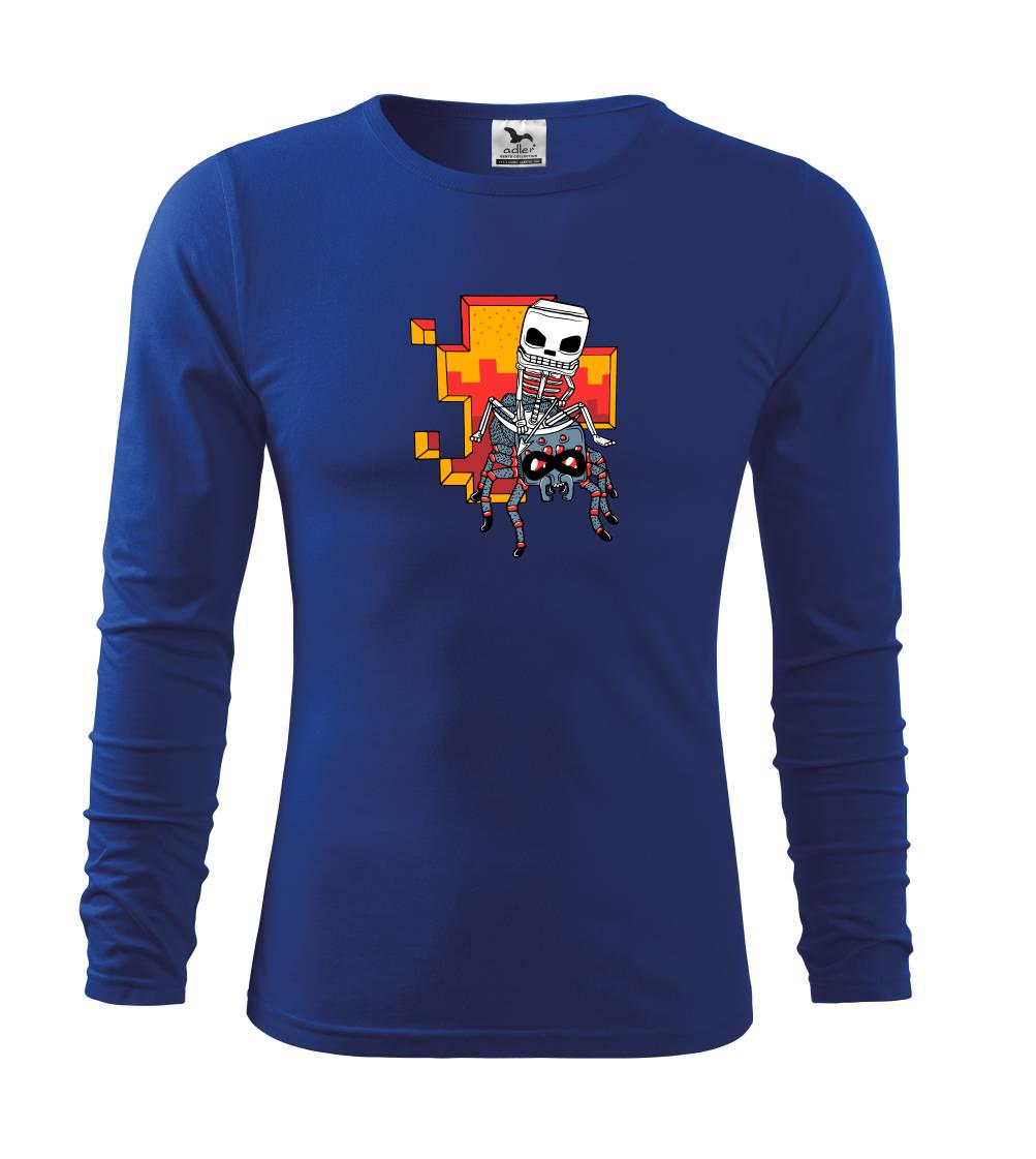 Tričko, na ktorom je kostlivec na pavúkovi. Pavúk sa nechcel nechať skrotiť, ale kostlivec ho nakoniec zdolal. Tričko s kostlivcom idúcim na pavúkovi.