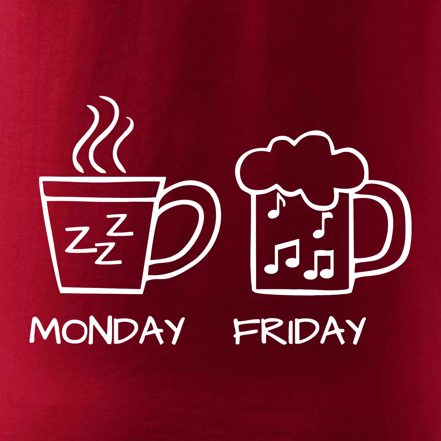 Pondelok si nevieš predstaviť bez kávy a piatok bez piva? Tak toto tričko je presne pre Teba! Vyberaj z rôznych farieb tričiek alebo mikín.