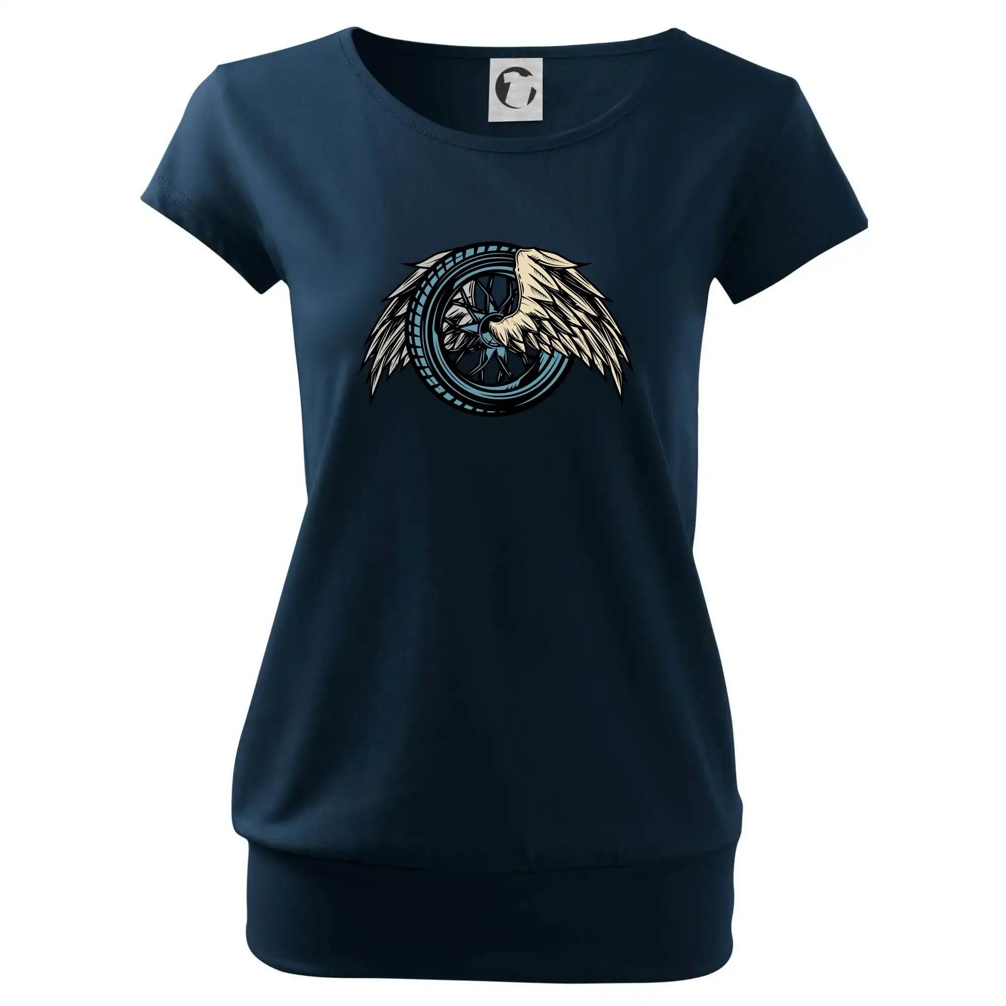 Trendové dámske tričko s veľmi krátkym rukávom, voľnejšieho strihu, v dolnom kraji všité do širokého lemu. Okrúhly priekrčník s úzkym lemom zo zhodného materiálu.
