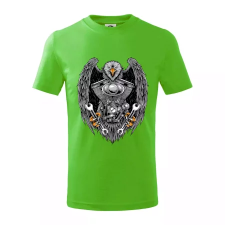 Detské tričko strednej gramáže s bočnými švami. Úzky priekrčník s prídavkom 5% elastanu. Vnútorná časť zadného priekrčníka začistená tkanou páskou. Spevnený ramenný šev.