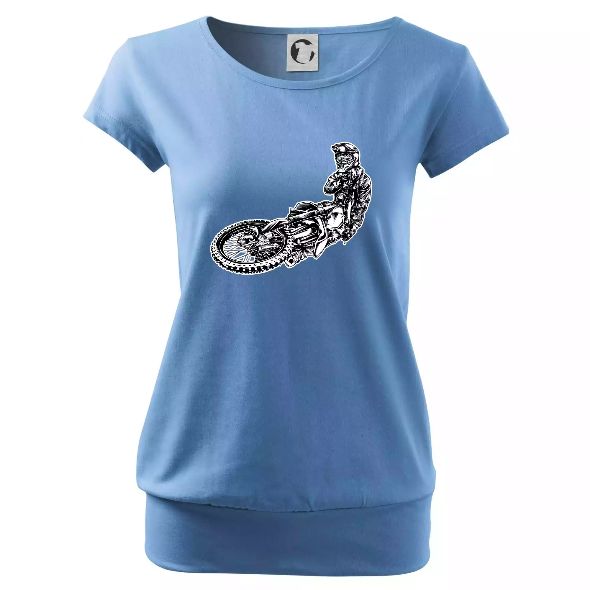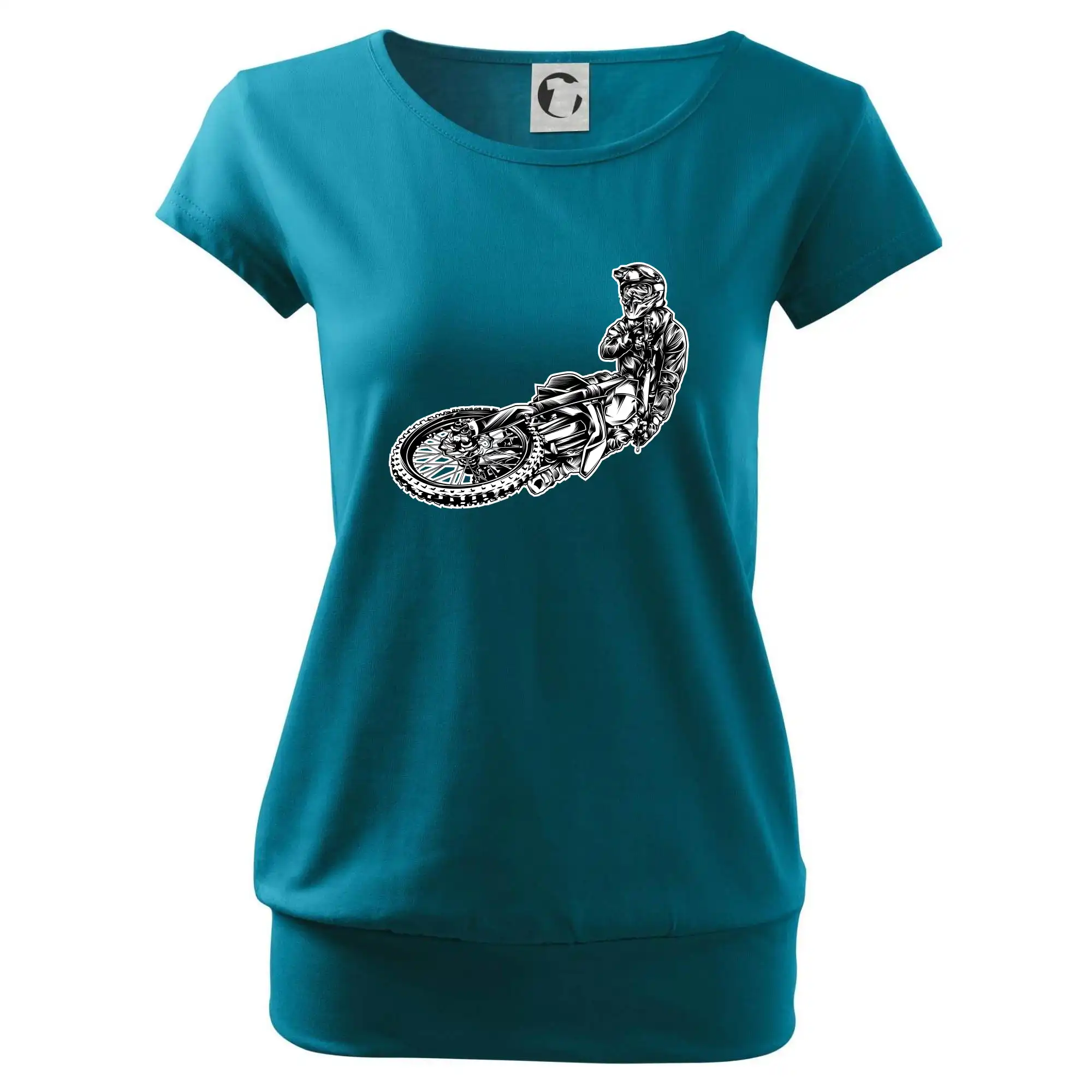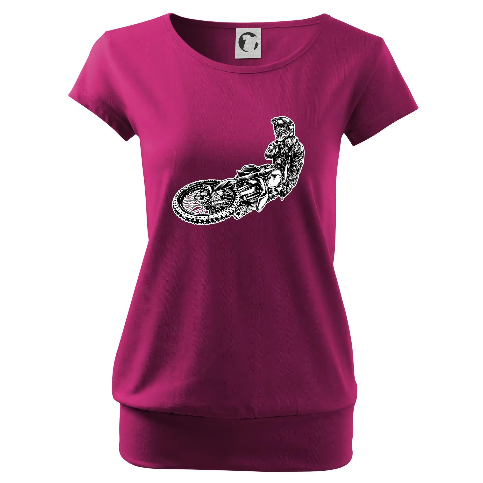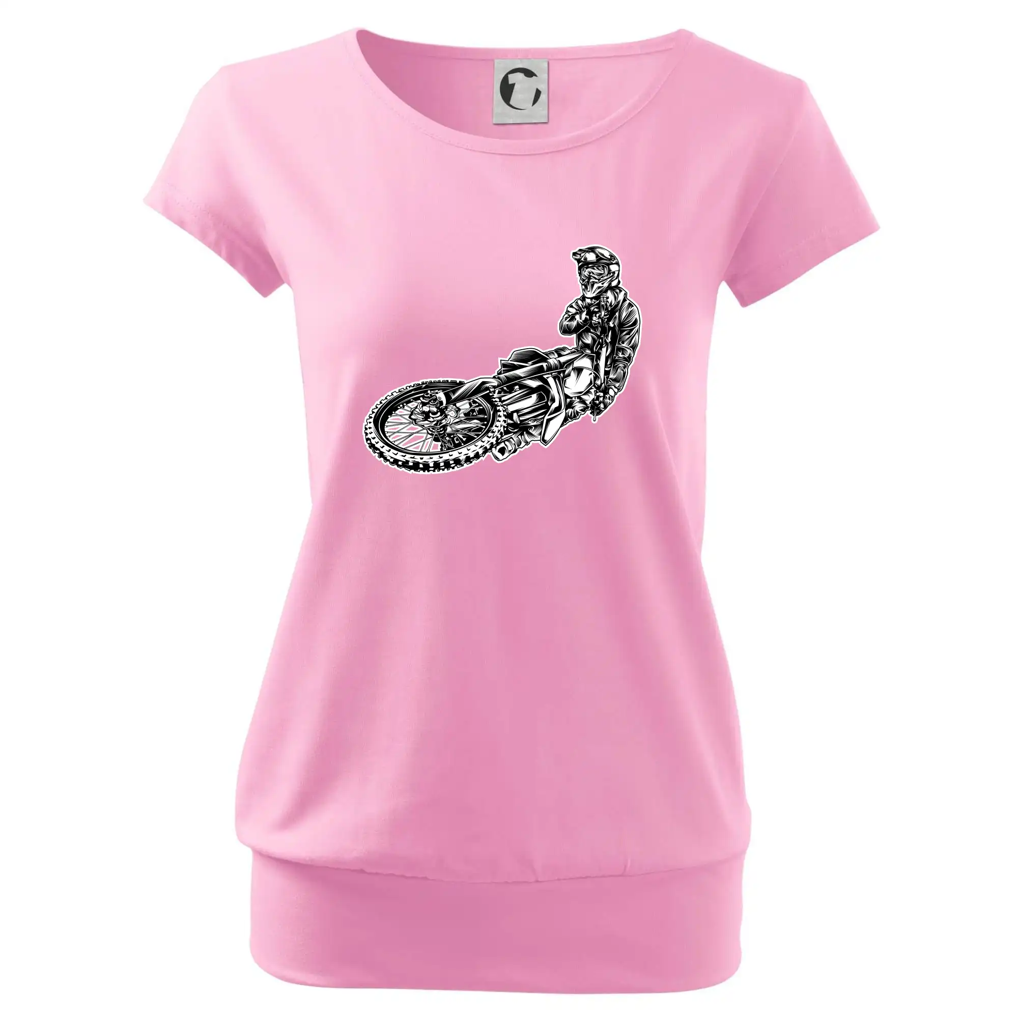 Trendové dámske tričko s veľmi krátkym rukávom, voľnejšieho strihu, v dolnom kraji všité do širokého lemu. Okrúhly priekrčník s úzkym lemom zo zhodného materiálu.