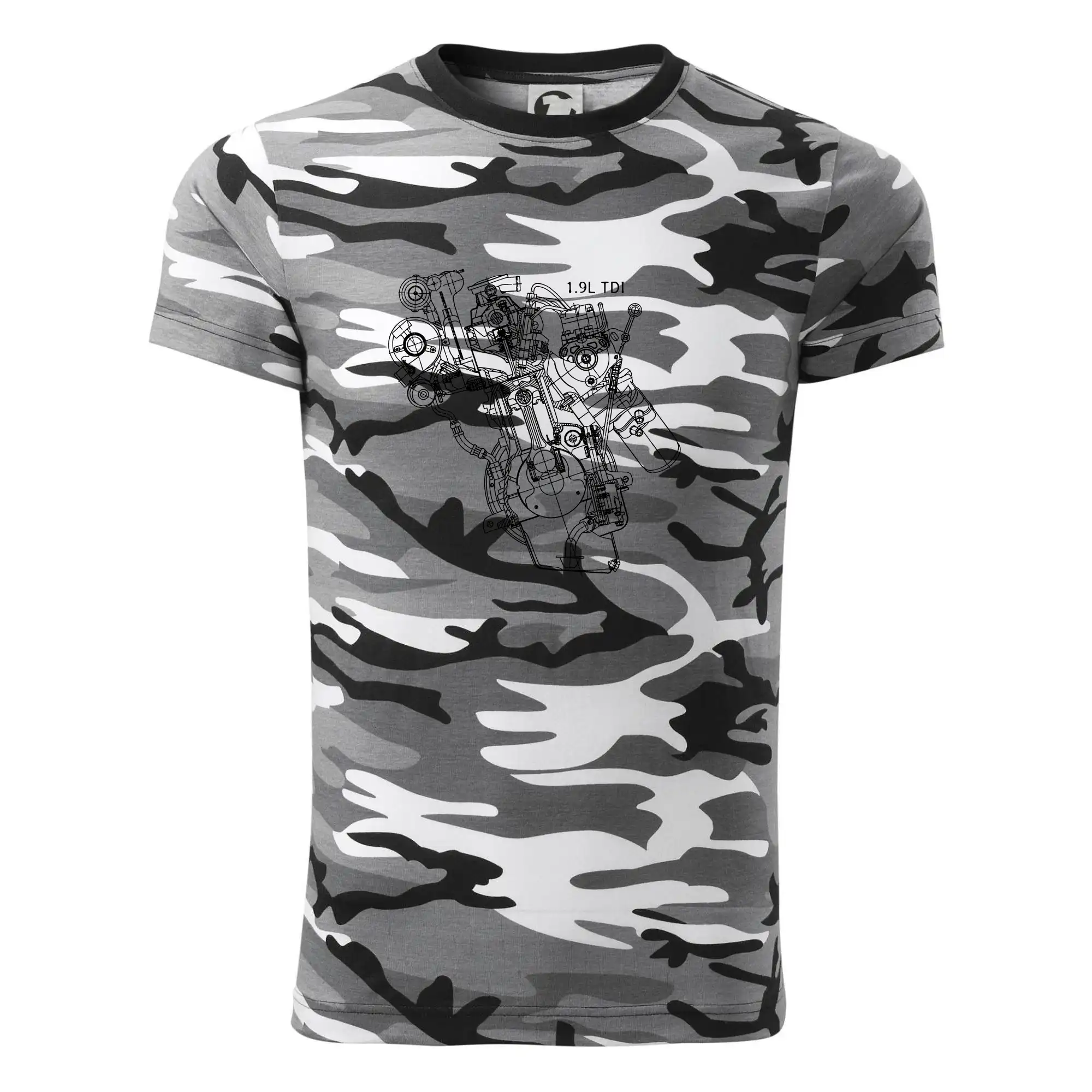Tričko strednej gramáže vo farbách camouflage. Strih s bočnými švami. Lem priekrčníku z rebrového úpletu s prídavkom 5% elastanu. Vnútorná časť zadného priekrčníka začistená páskou vo farbe camouflage.