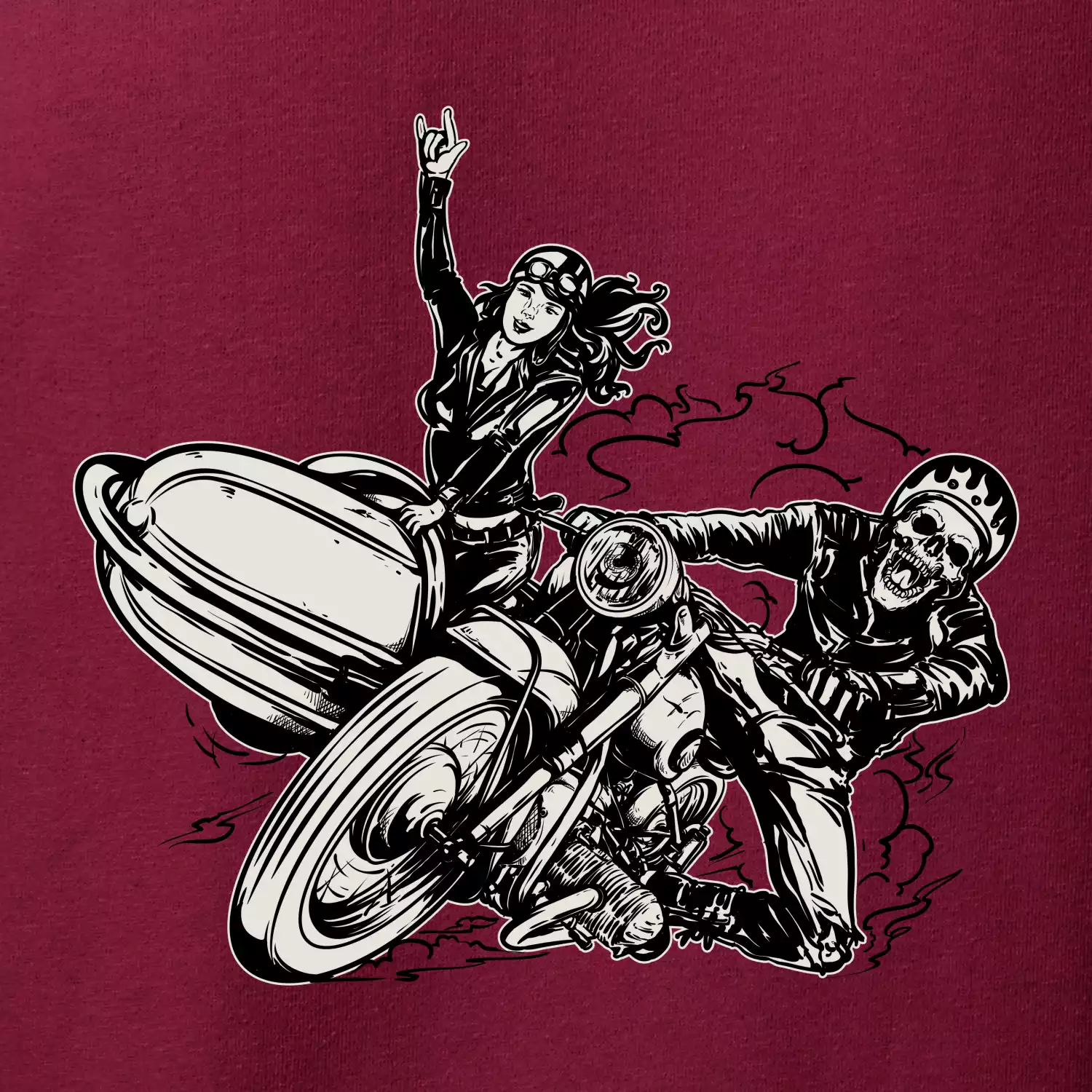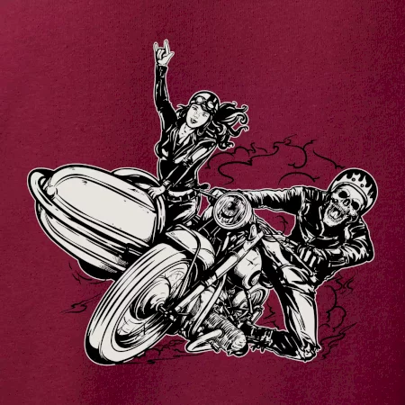 Tričko pre motorkára, na ktorom je motorkár kostlivec na motorke. Sajdkára pri motorke je skvelá možnosť ako sa môže pri Tvojom pekelnom stroji objaviť aj krásne dievča stopárka. Motorka je životný štýl, tak to ukáž tým, že si kúpiš tričko s motorkou. Pokiaľ si pravý motorkár máš rád rýchlosť, motorka so sajdkárou je motív ideálny pre Teba.