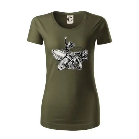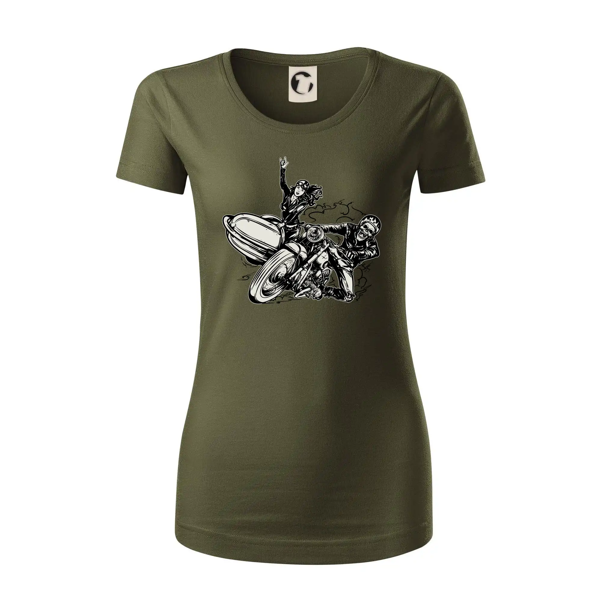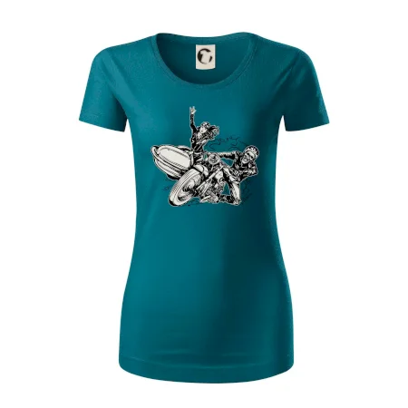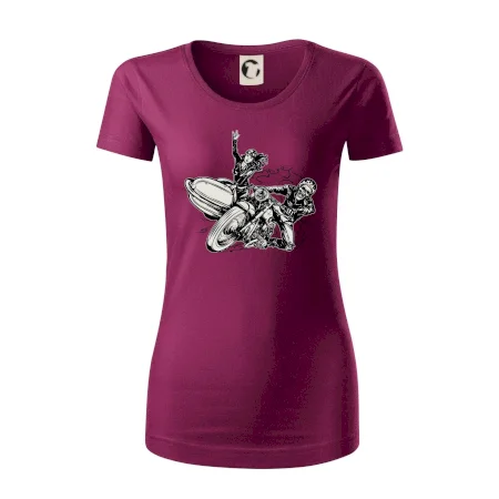 Tričko pre motorkára, na ktorom je motorkár kostlivec na motorke. Sajdkára pri motorke je skvelá možnosť ako sa môže pri Tvojom pekelnom stroji objaviť aj krásne dievča stopárka. Motorka je životný štýl, tak to ukáž tým, že si kúpiš tričko s motorkou. Pokiaľ si pravý motorkár máš rád rýchlosť, motorka so sajdkárou je motív ideálny pre Teba.