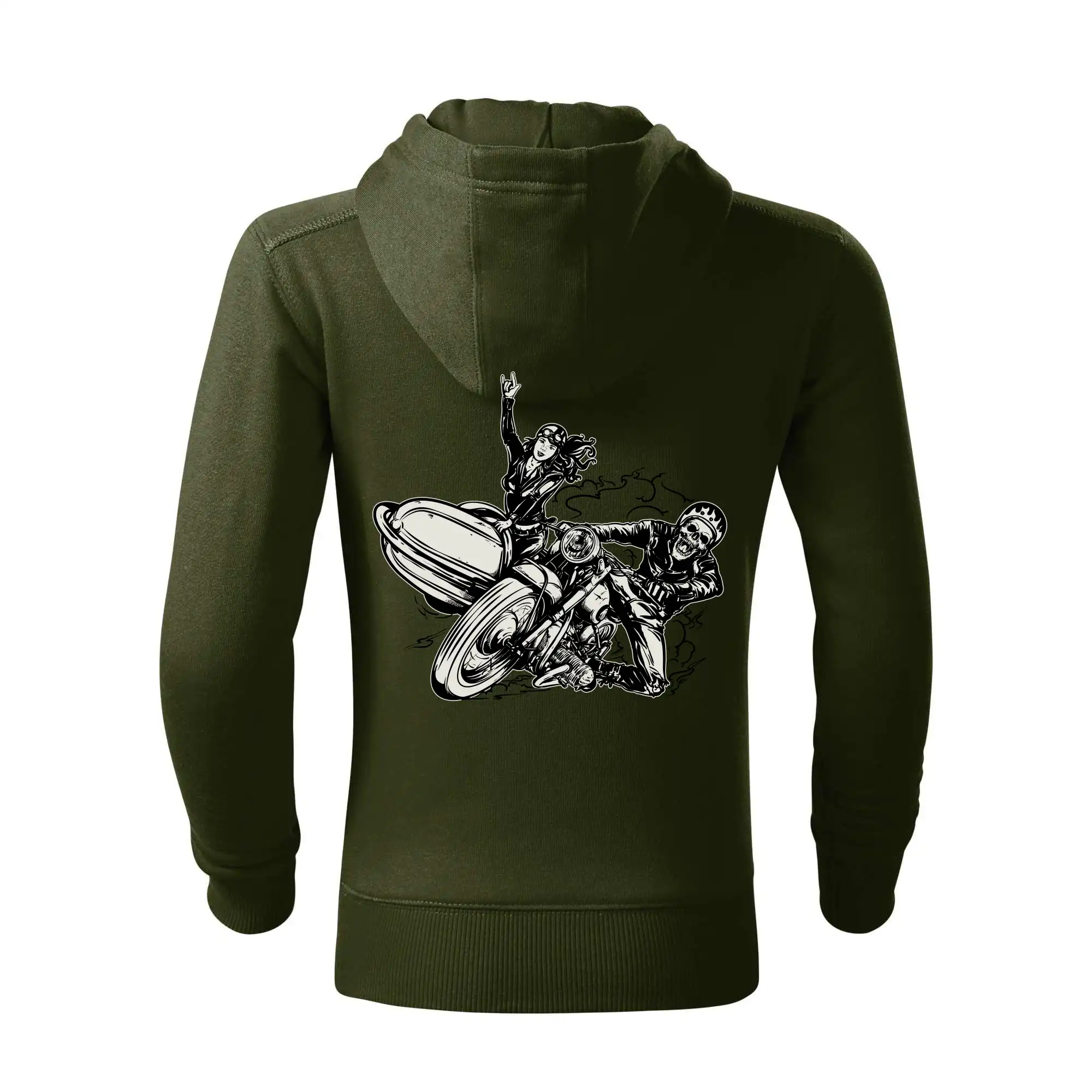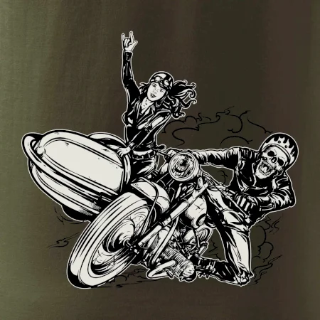 Tričko pre motorkára, na ktorom je motorkár kostlivec na motorke. Sajdkára pri motorke je skvelá možnosť ako sa môže pri Tvojom pekelnom stroji objaviť aj krásne dievča stopárka. Motorka je životný štýl, tak to ukáž tým, že si kúpiš tričko s motorkou. Pokiaľ si pravý motorkár máš rád rýchlosť, motorka so sajdkárou je motív ideálny pre Teba.