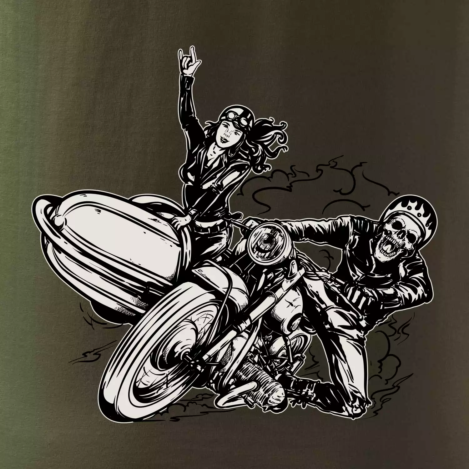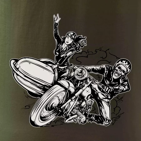 Tričko pre motorkára, na ktorom je motorkár kostlivec na motorke. Sajdkára pri motorke je skvelá možnosť ako sa môže pri Tvojom pekelnom stroji objaviť aj krásne dievča stopárka. Motorka je životný štýl, tak to ukáž tým, že si kúpiš tričko s motorkou. Pokiaľ si pravý motorkár máš rád rýchlosť, motorka so sajdkárou je motív ideálny pre Teba.