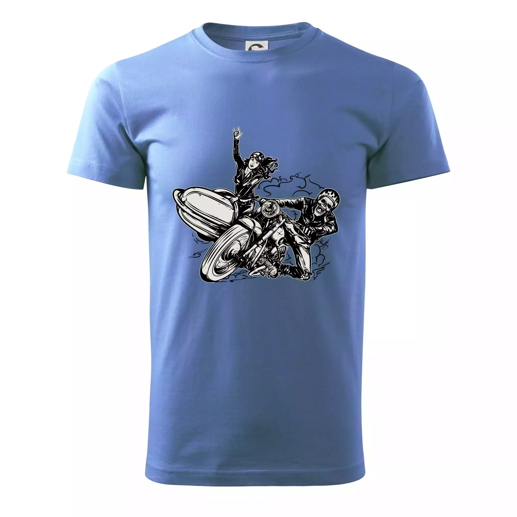 Tričko pre motorkára, na ktorom je motorkár kostlivec na motorke. Sajdkára pri motorke je skvelá možnosť ako sa môže pri Tvojom pekelnom stroji objaviť aj krásne dievča stopárka. Motorka je životný štýl, tak to ukáž tým, že si kúpiš tričko s motorkou. Pokiaľ si pravý motorkár máš rád rýchlosť, motorka so sajdkárou je motív ideálny pre Teba.