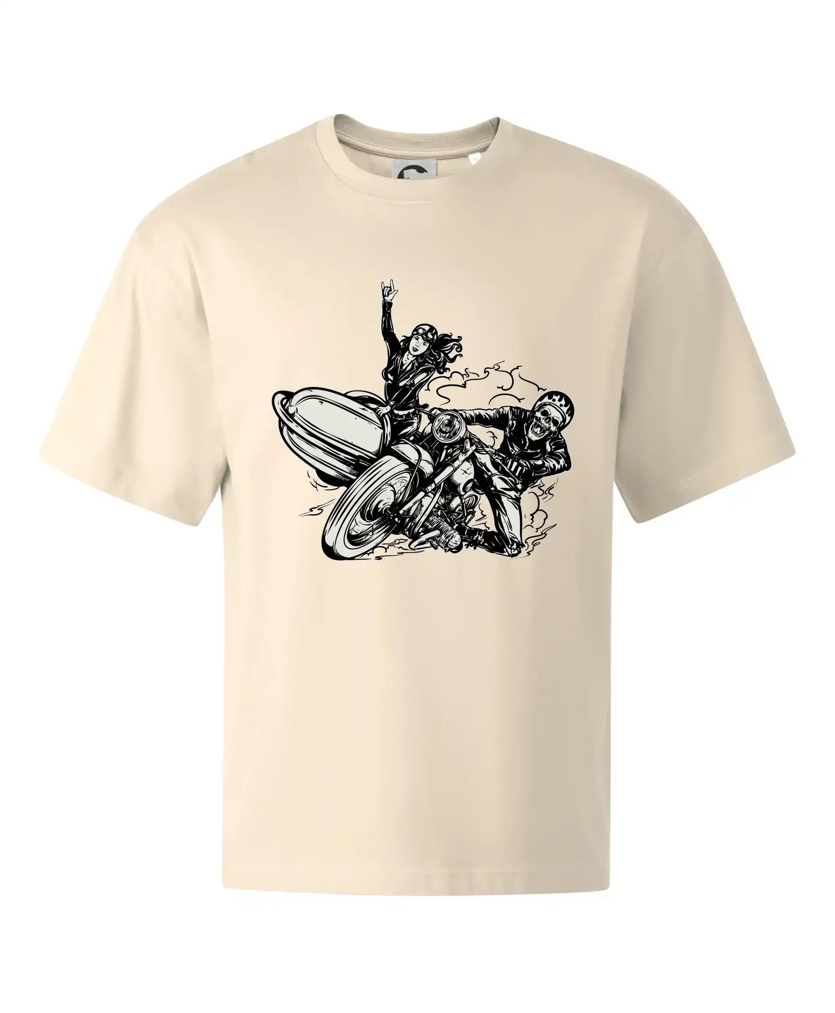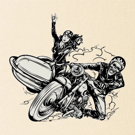 Tričko pre motorkára, na ktorom je motorkár kostlivec na motorke. Sajdkára pri motorke je skvelá možnosť ako sa môže pri Tvojom pekelnom stroji objaviť aj krásne dievča stopárka. Motorka je životný štýl, tak to ukáž tým, že si kúpiš tričko s motorkou. Pokiaľ si pravý motorkár máš rád rýchlosť, motorka so sajdkárou je motív ideálny pre Teba.
